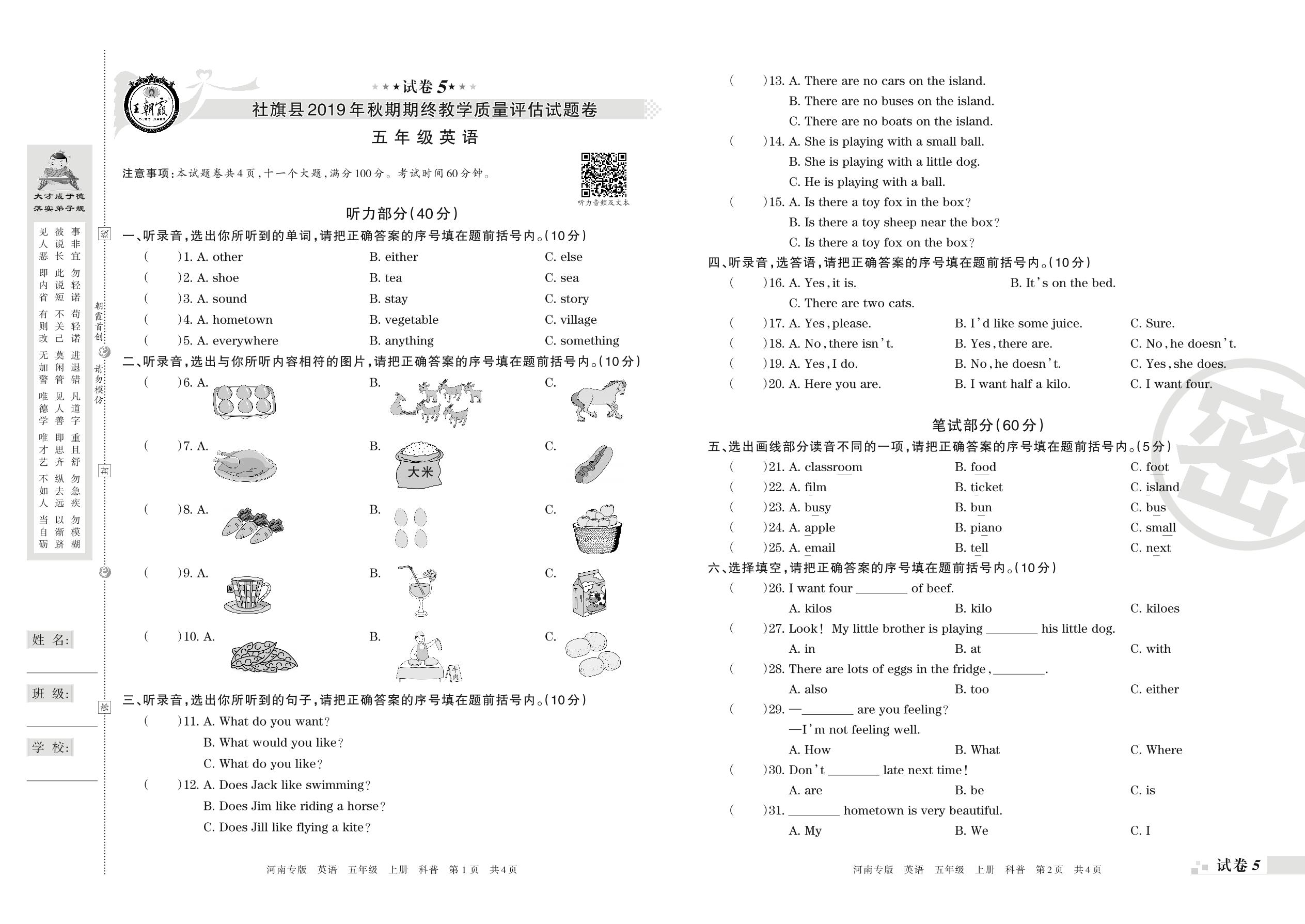 2019-2020学年第一学期南阳市社旗县五年级英语试卷(科普版)【5】