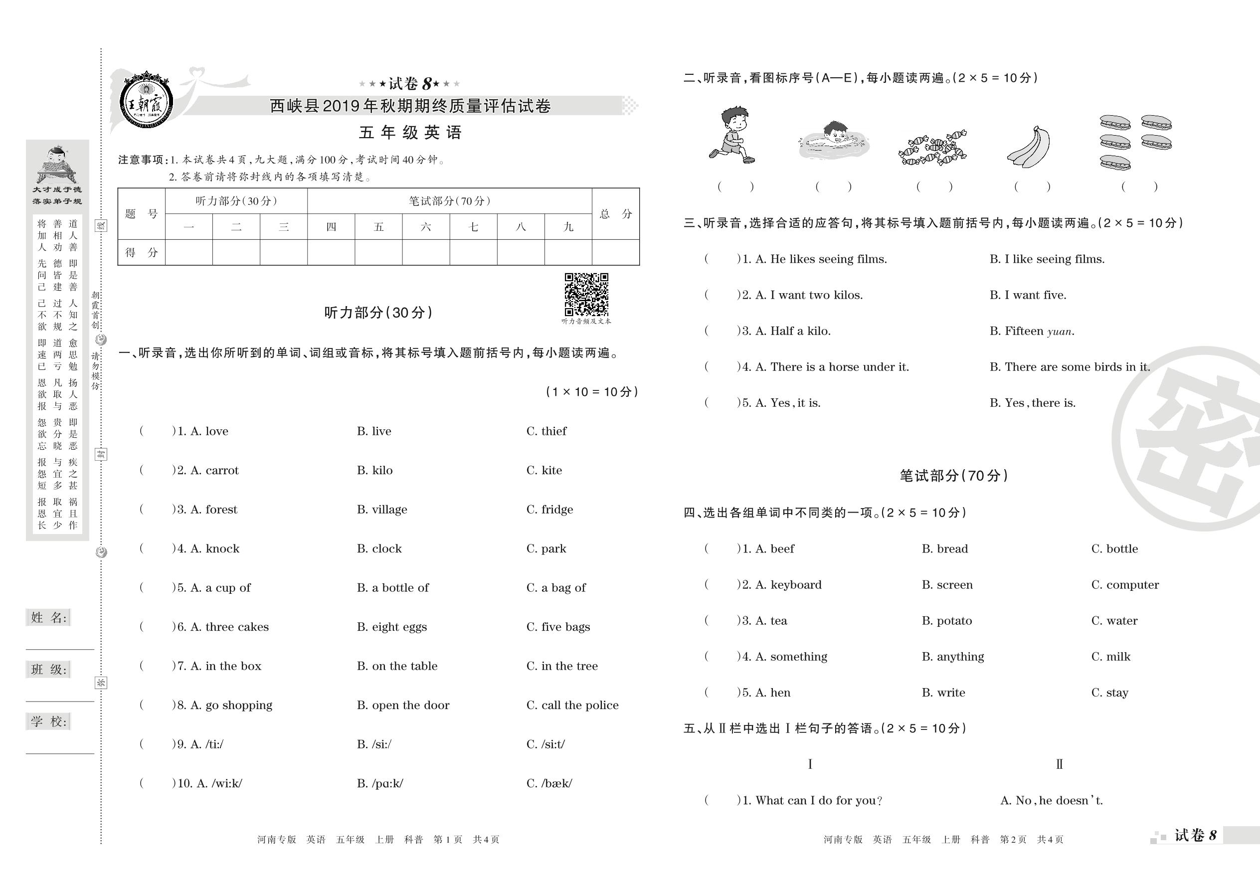 2019-2020学年第一学期南阳市西峡县五年级英语试卷(科普版)【8】
