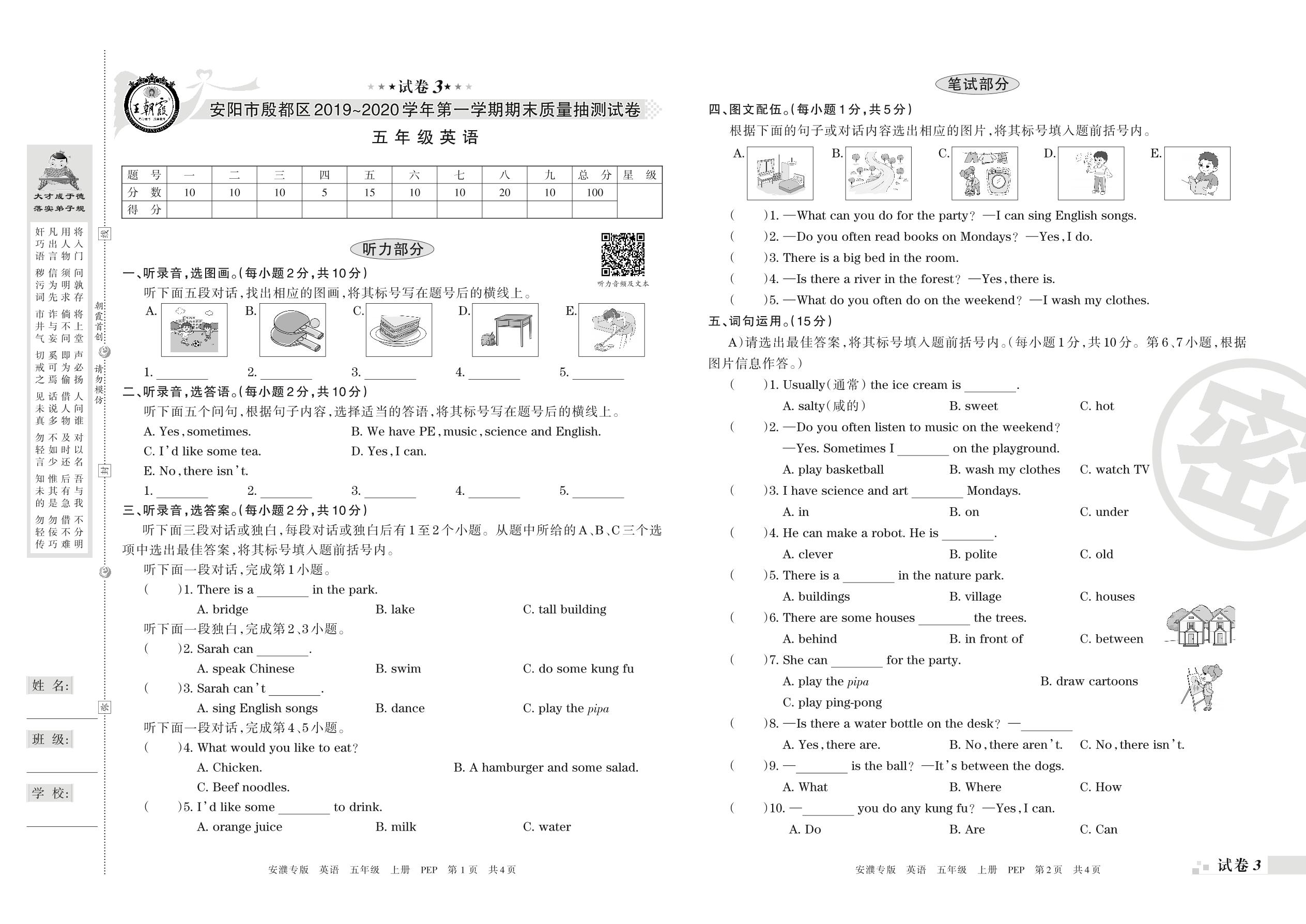 2019-2020学年第一学期安阳市殷都区五年级英语试卷(PEP版)【3】