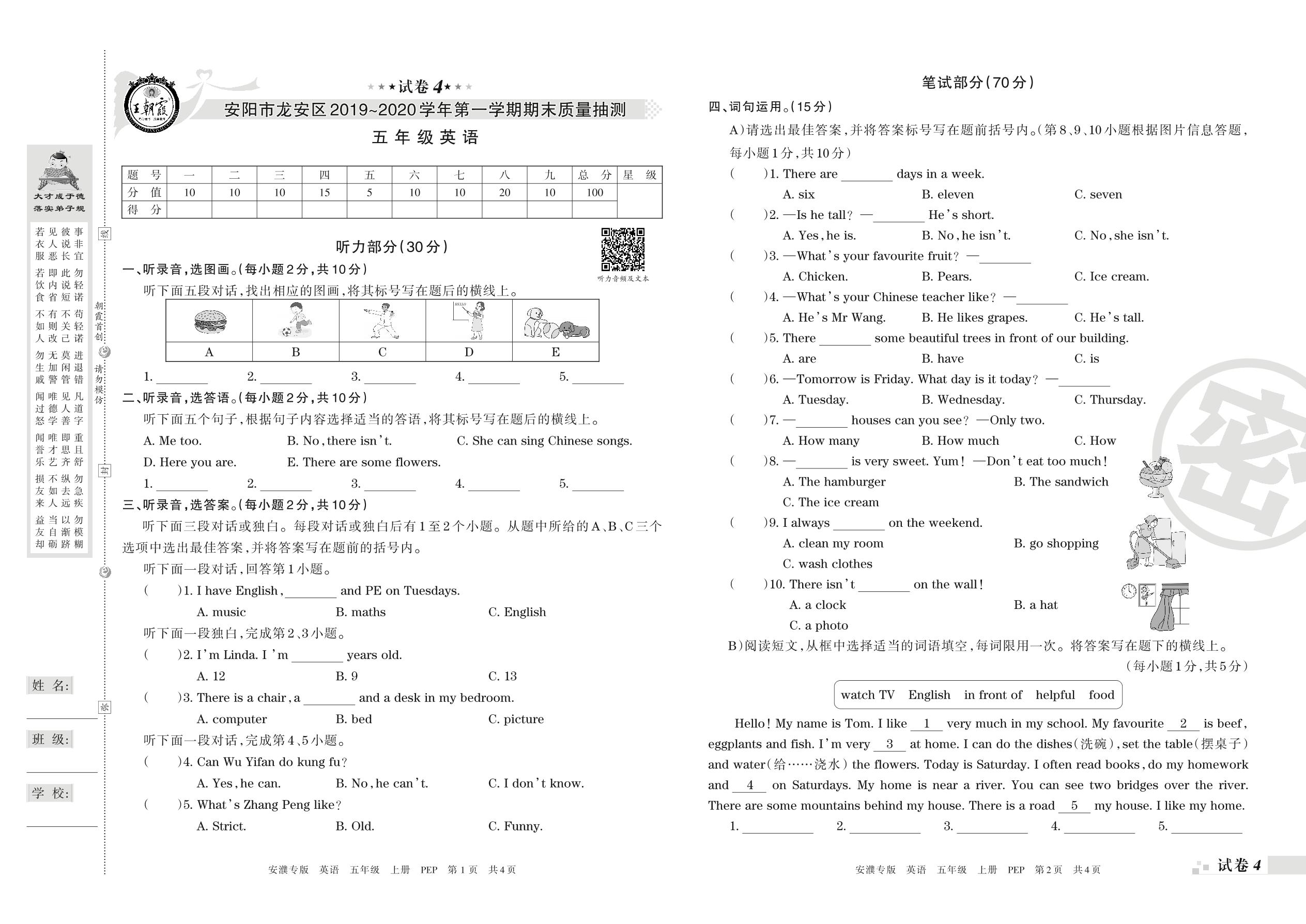 2019-2020学年第一学期安阳市龙安区五年级英语试卷(PEP版)【4】