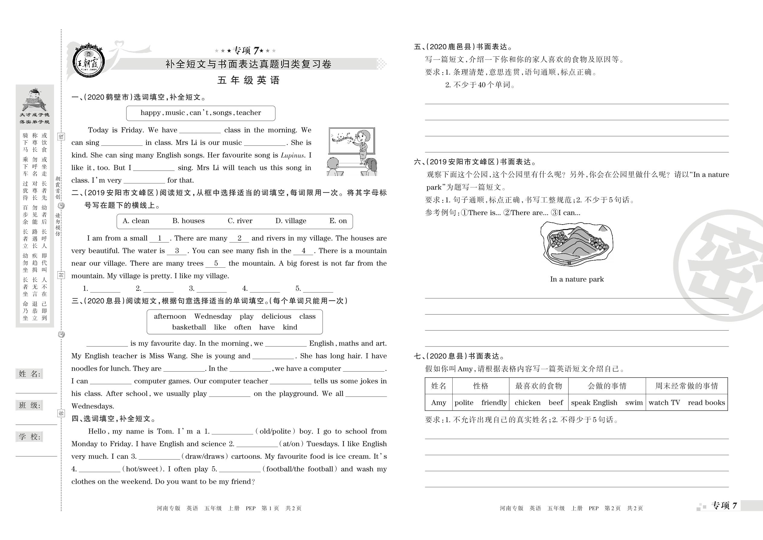 王朝霞期末专项卷——补全短文与书面表达真题归类复习、绘本阅读五年级上册英语(PEP版)【0】