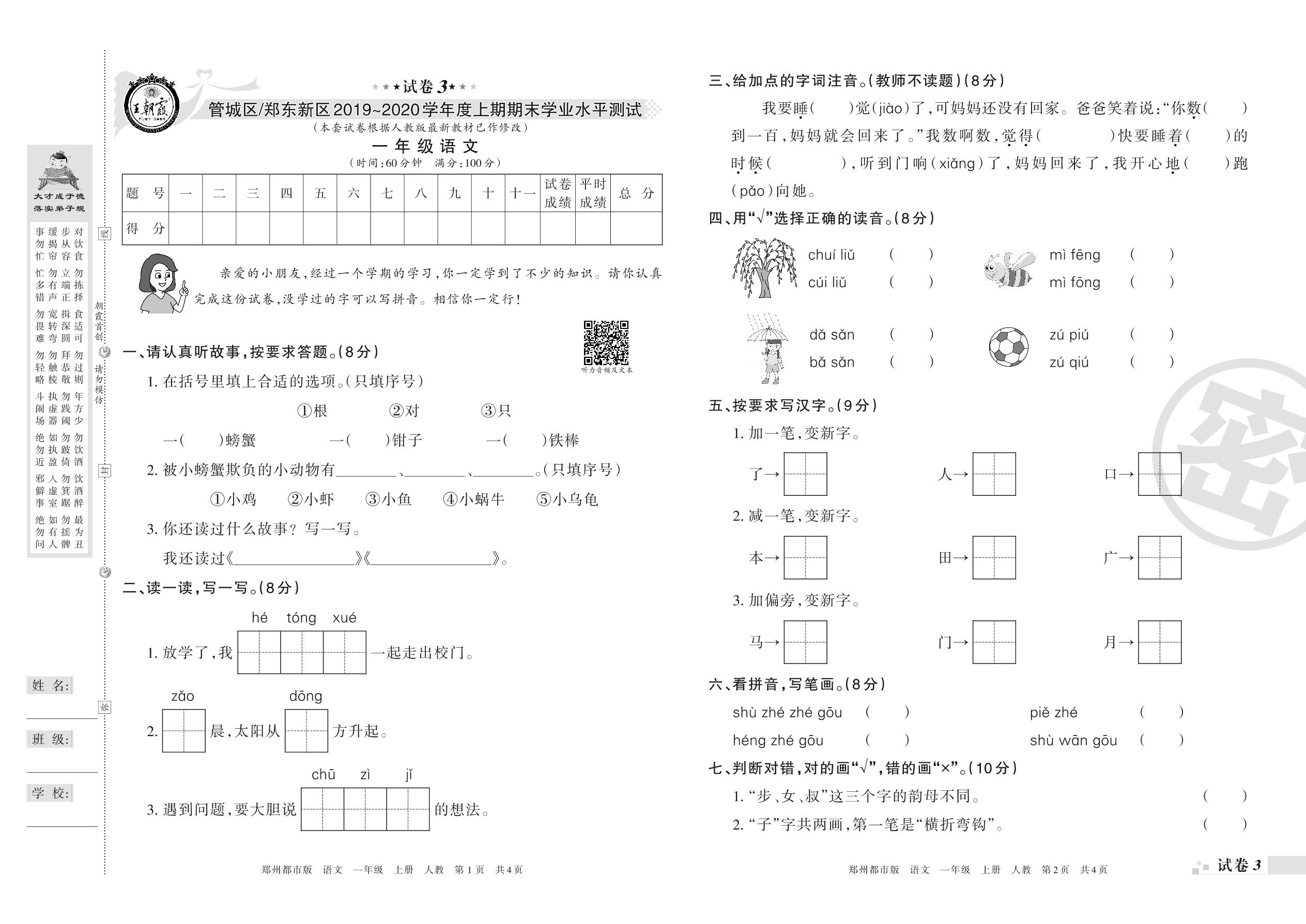 2019-2020学年第一学期郑州市管城区(郑东新区)一年级语文试卷(人教版)_R210731175150【3】