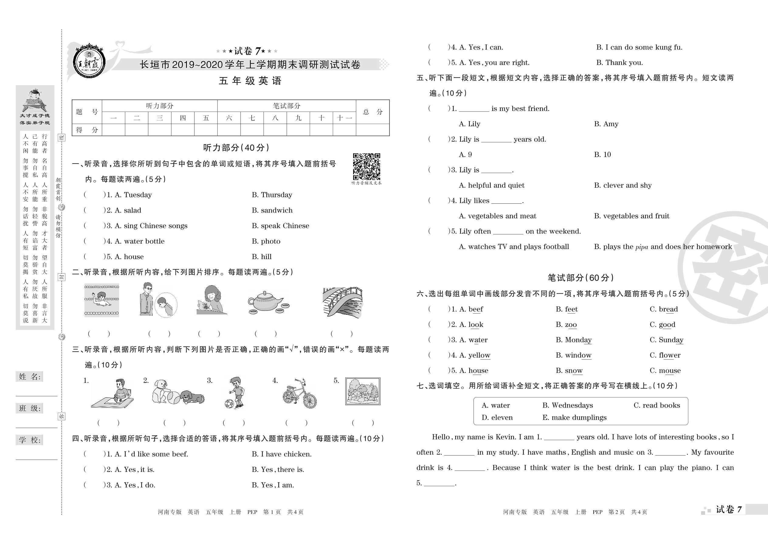 2019-2020学年第一学期长垣市五年级英语试卷(PEP版)【7】