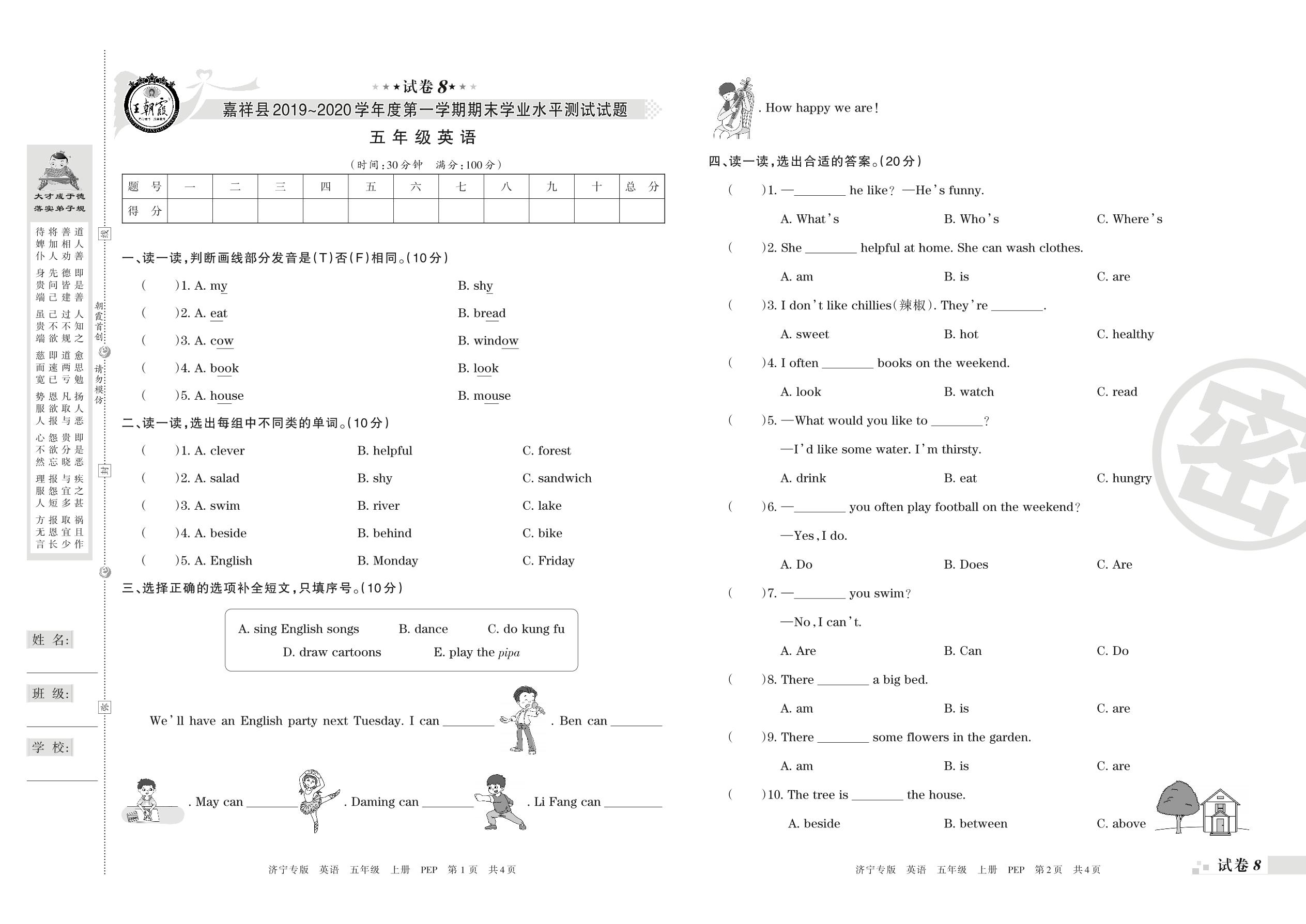 2019-2020学年第一学期济宁市嘉祥县五年级英语试卷(PEP版)【8】