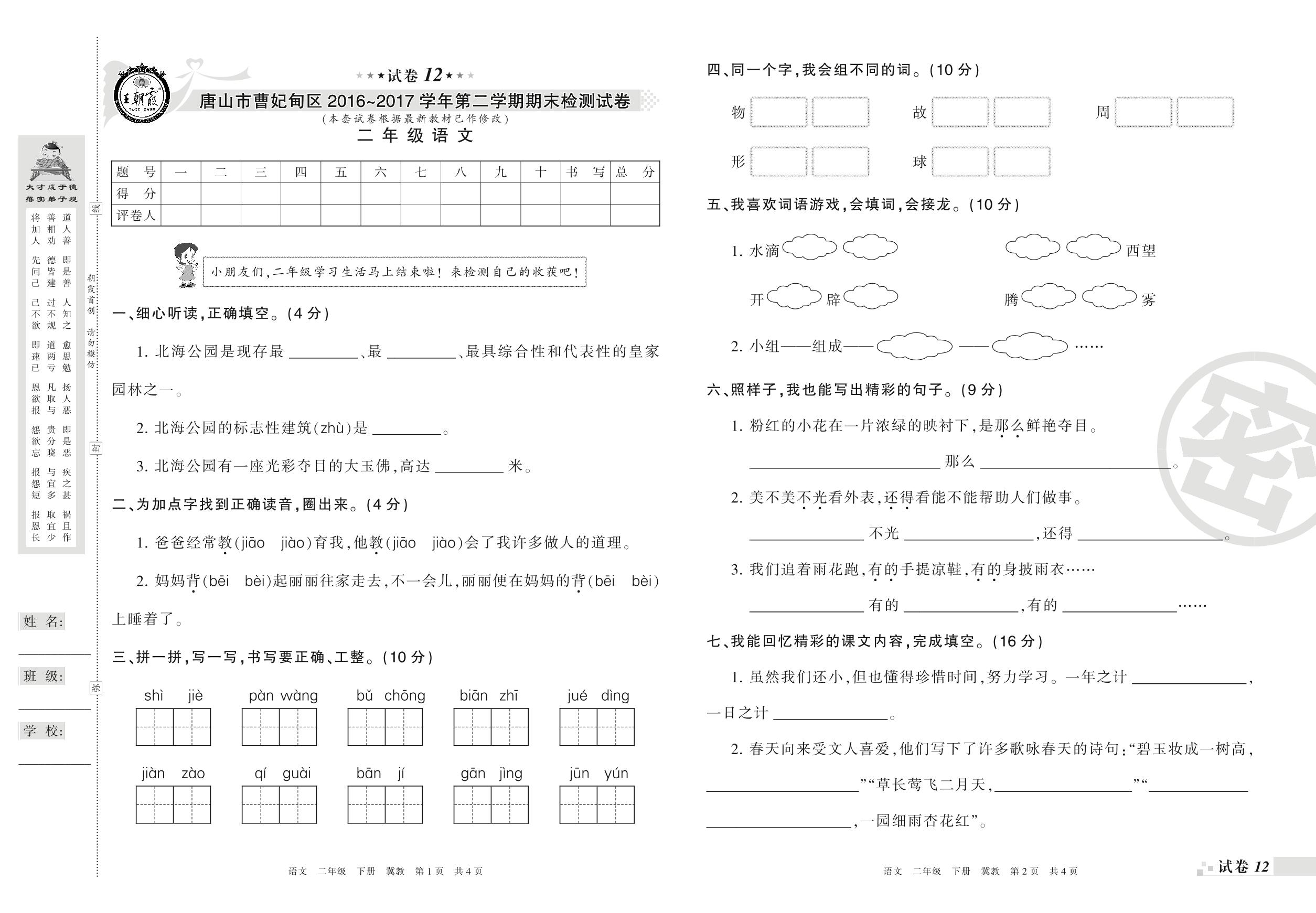 2016-2017学年第二学期唐山市曹妃甸区二年级语文试卷(冀教版)【12】