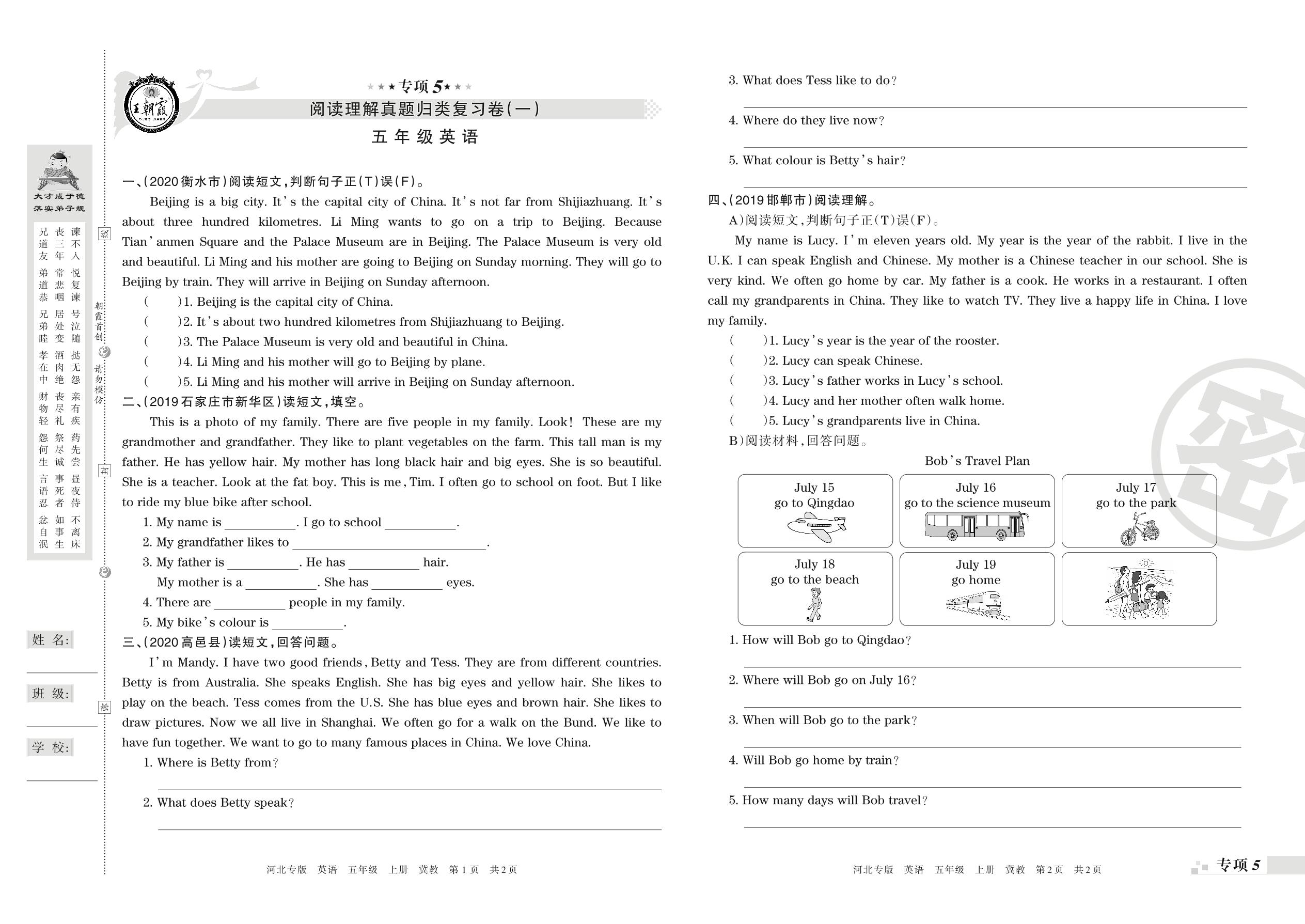 王朝霞期末专项卷——阅读理解真题归类复习五年级上册英语(冀教版)【0】