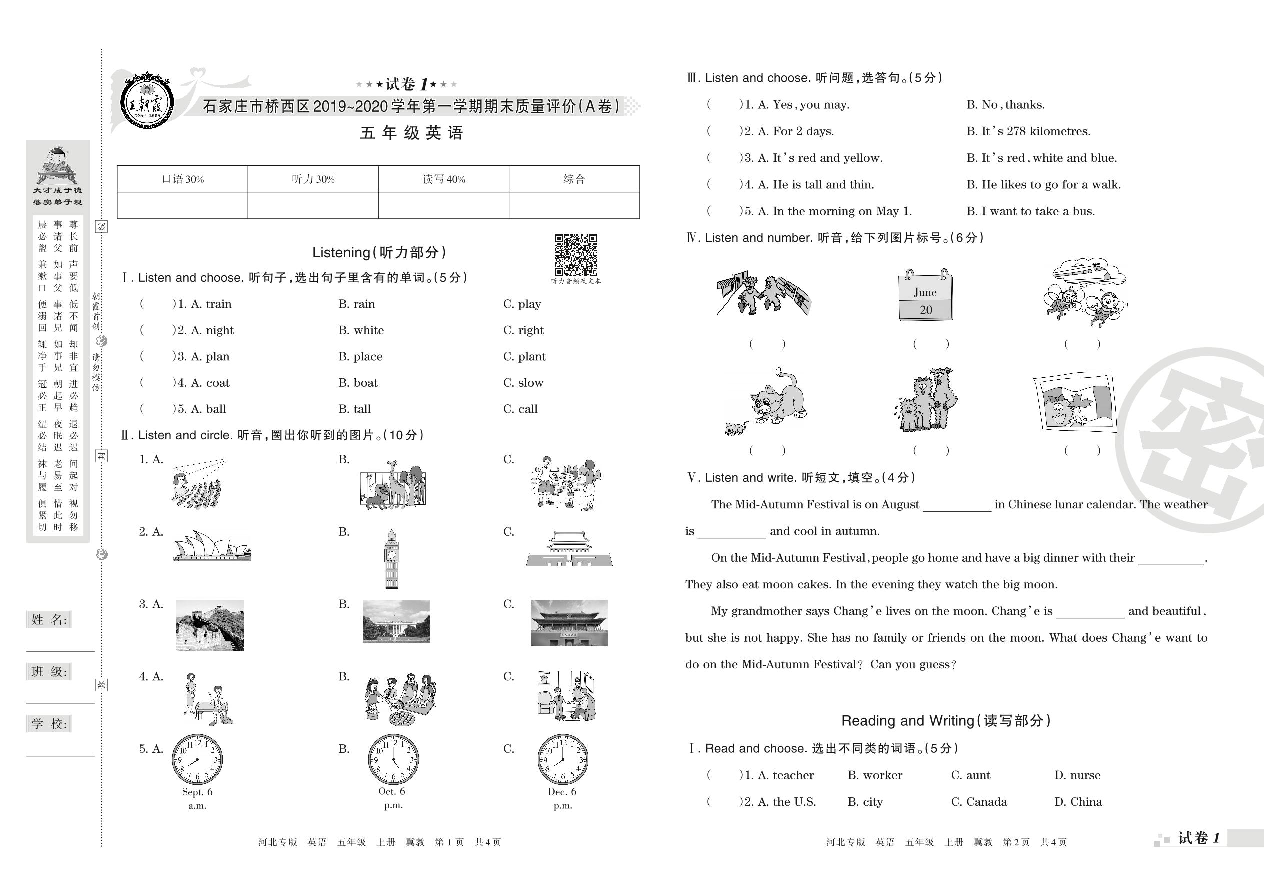 2019-2020学年第一学期石家庄市桥西区五年级英语试卷(冀教版)【1】