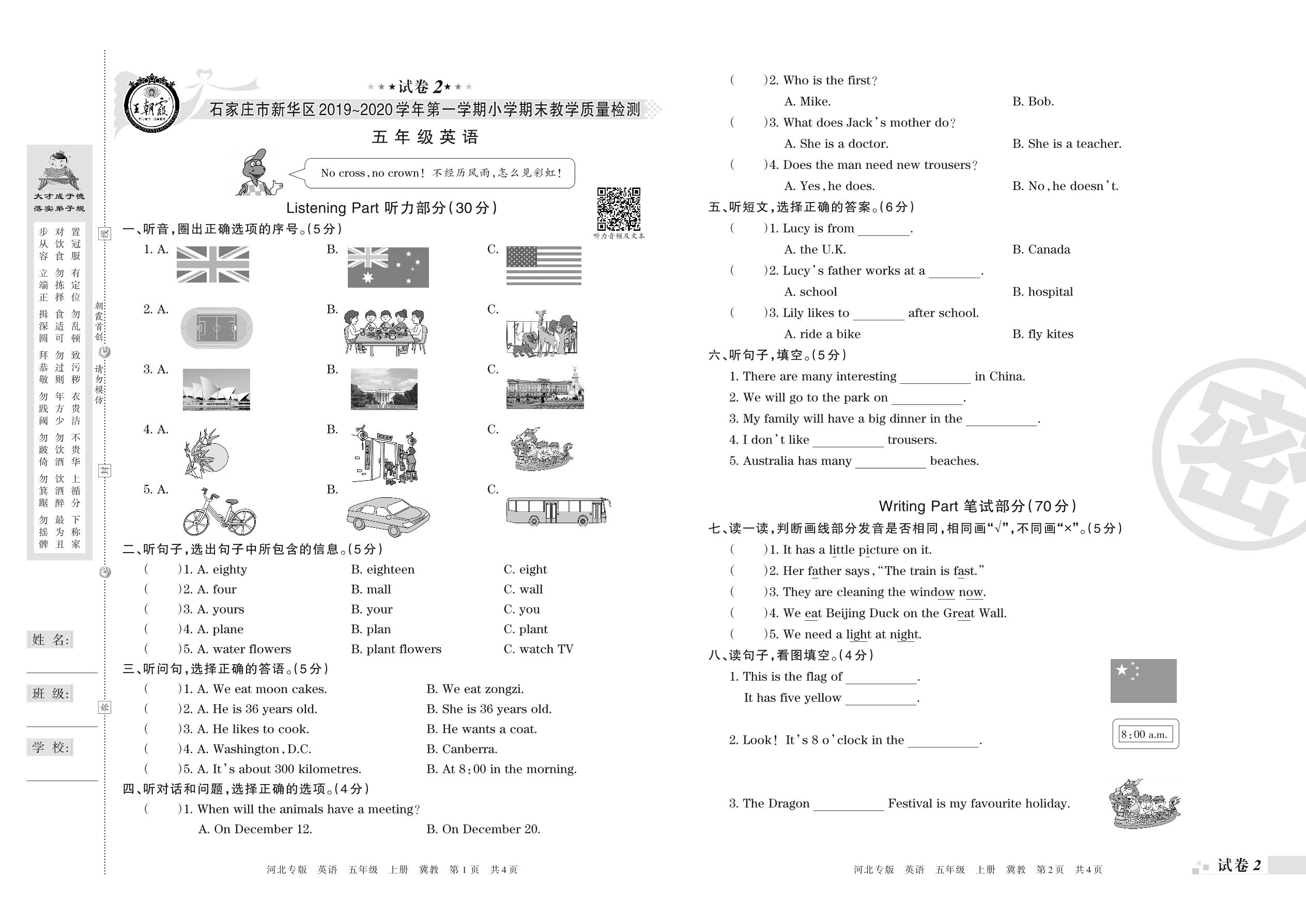 2019-2020学年第一学期石家庄市新华区五年级英语试卷(冀教版)【2】