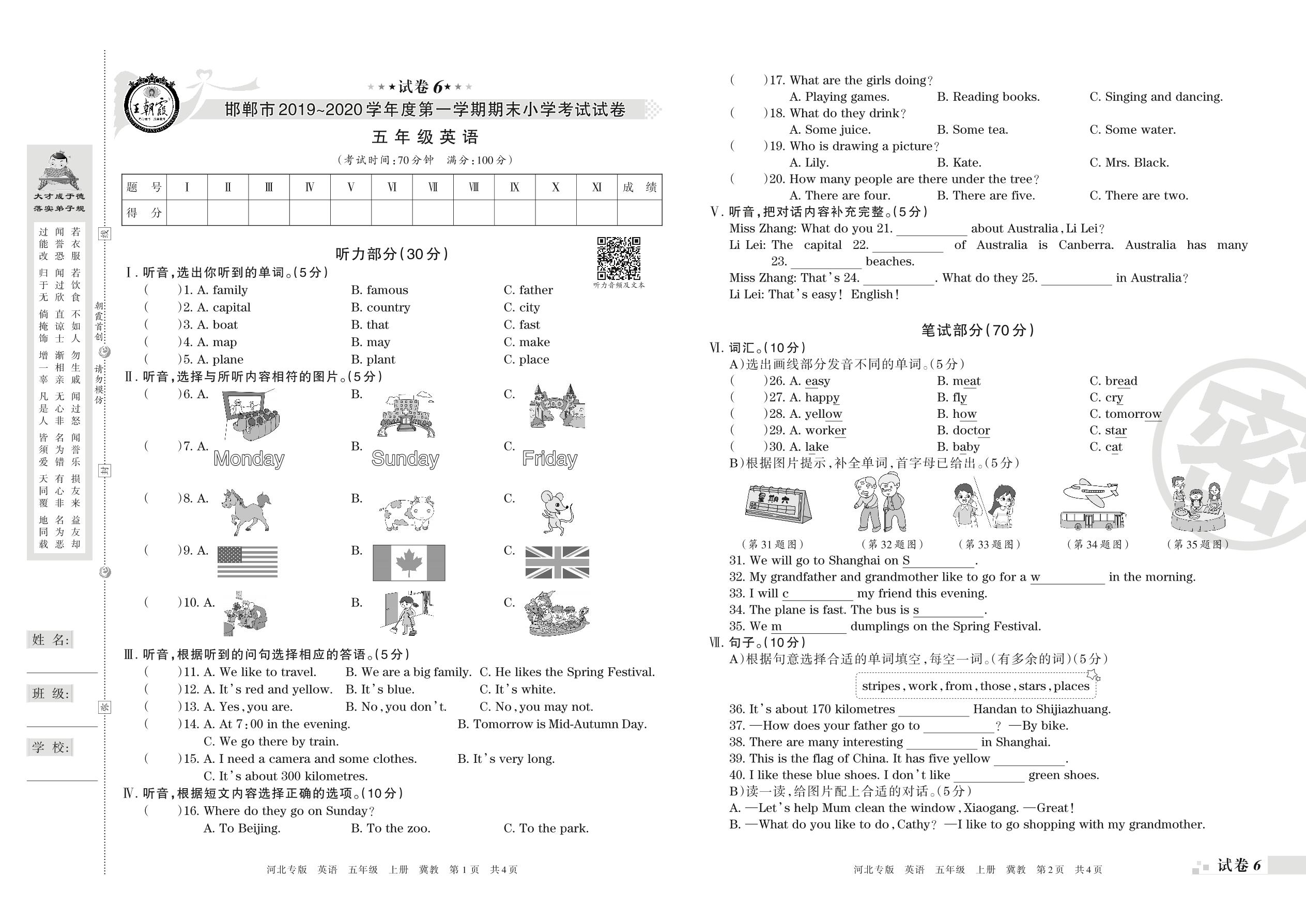 2019-2020学年第一学期邯郸市五年级英语试卷(冀教版)【6】