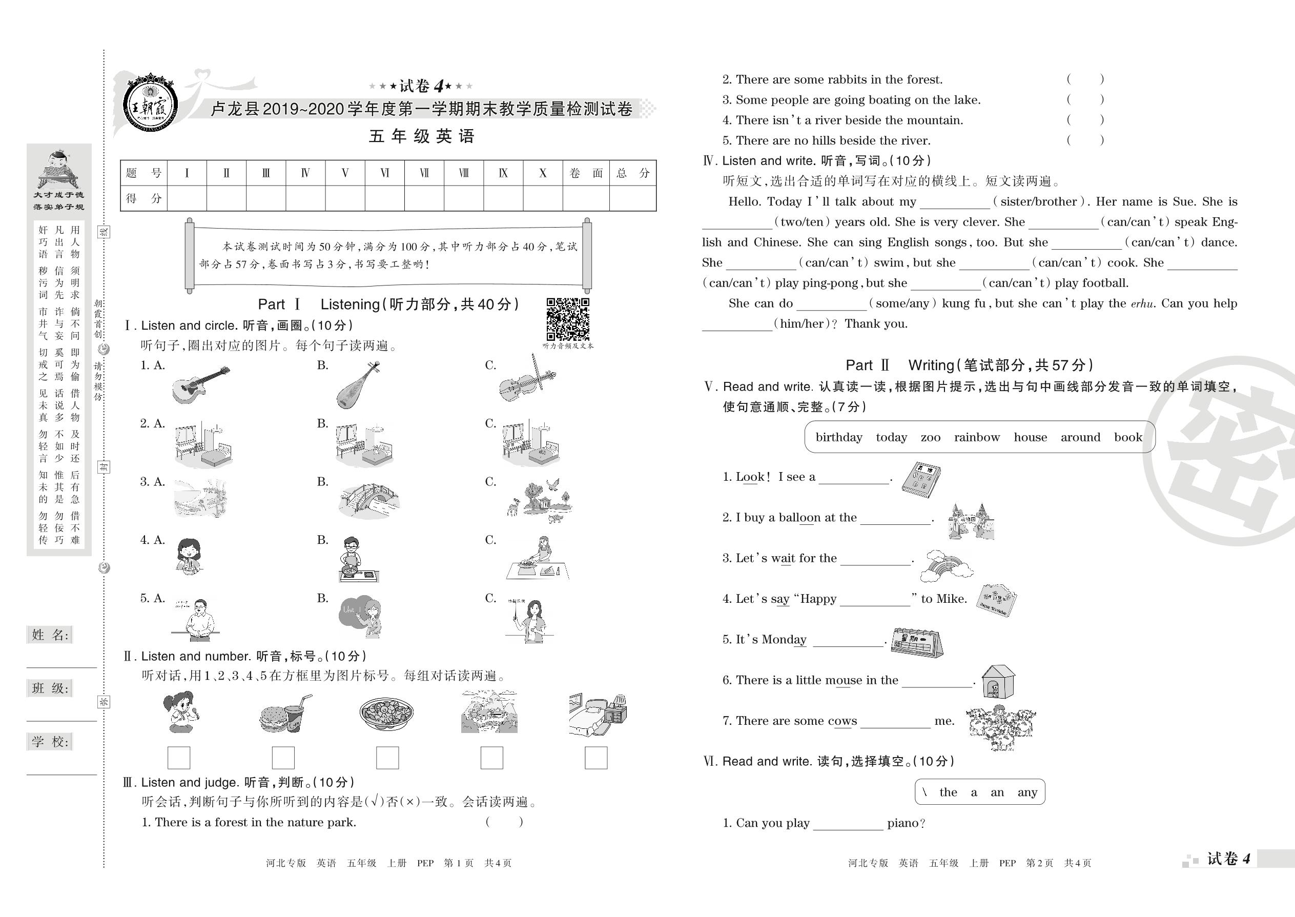 2019-2020学年第一学期秦皇岛市卢龙县五年级英语试卷(PEP版)【4】