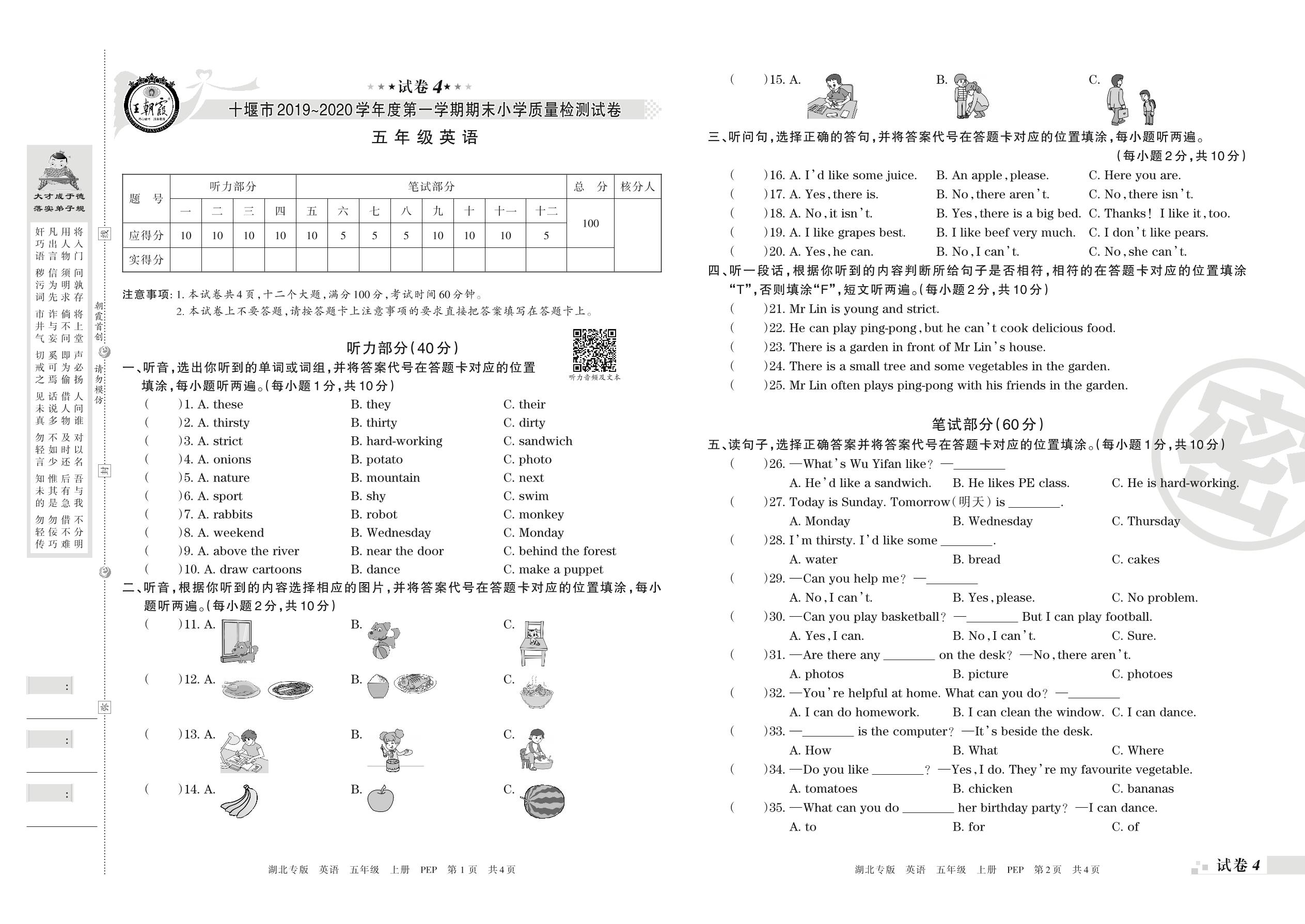 2019-2020学年第一学期十堰市五年级英语试卷(PEP版)【4】