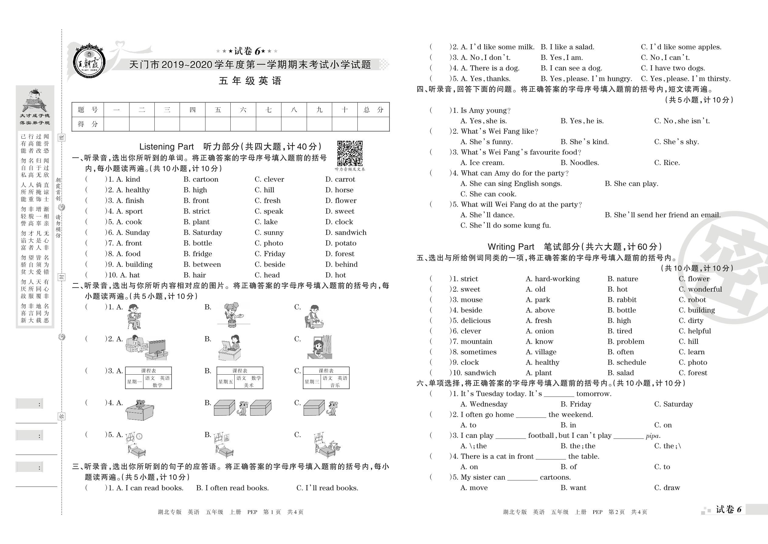 2019-2020学年第一学期天门市五年级英语试卷(PEP版)【6】