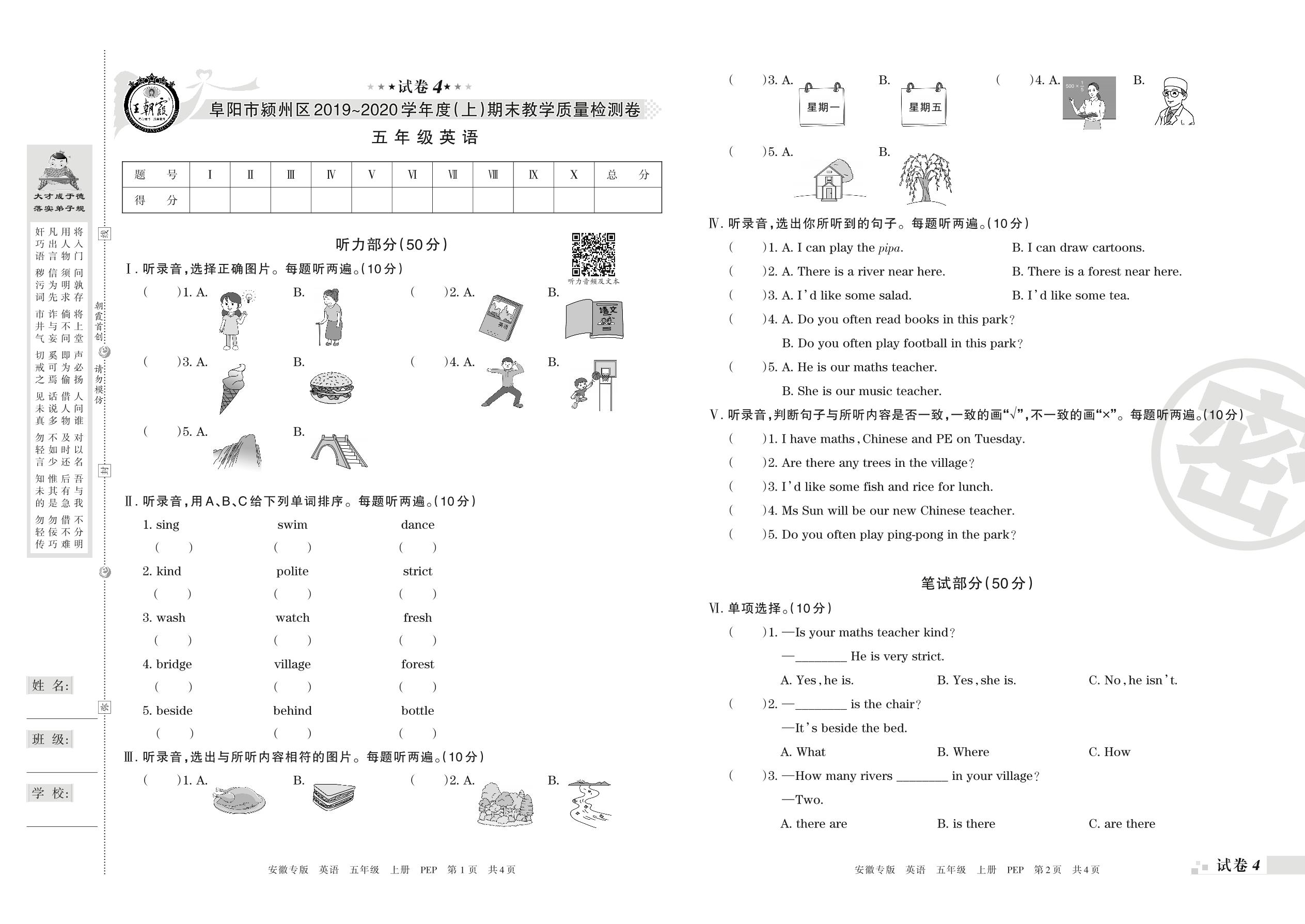 2019-2020学年第一学期阜阳市颍州区五年级英语试卷(PEP版)【4】