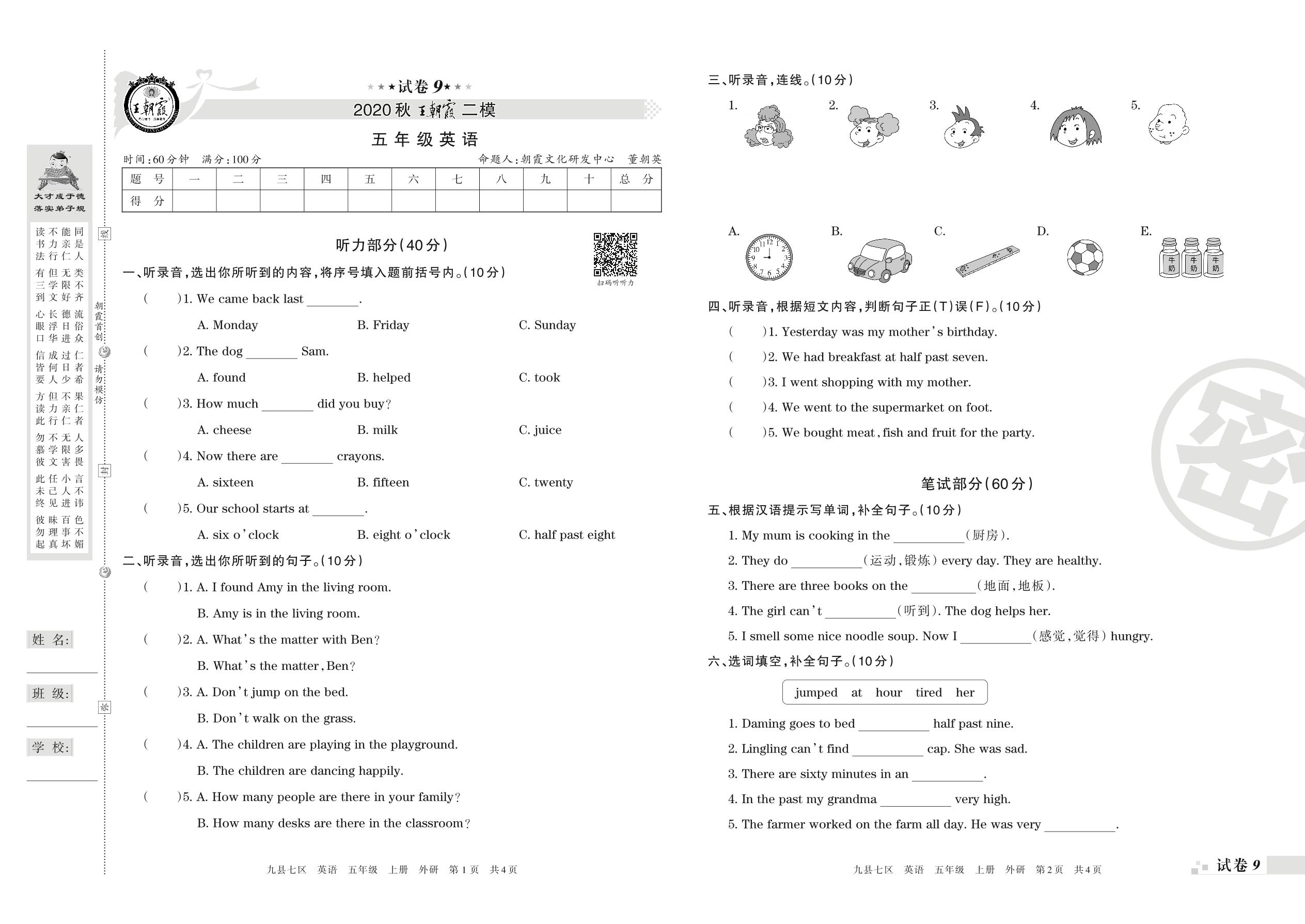 王朝霞期末模拟卷五年级上册英语(外研版)【9】