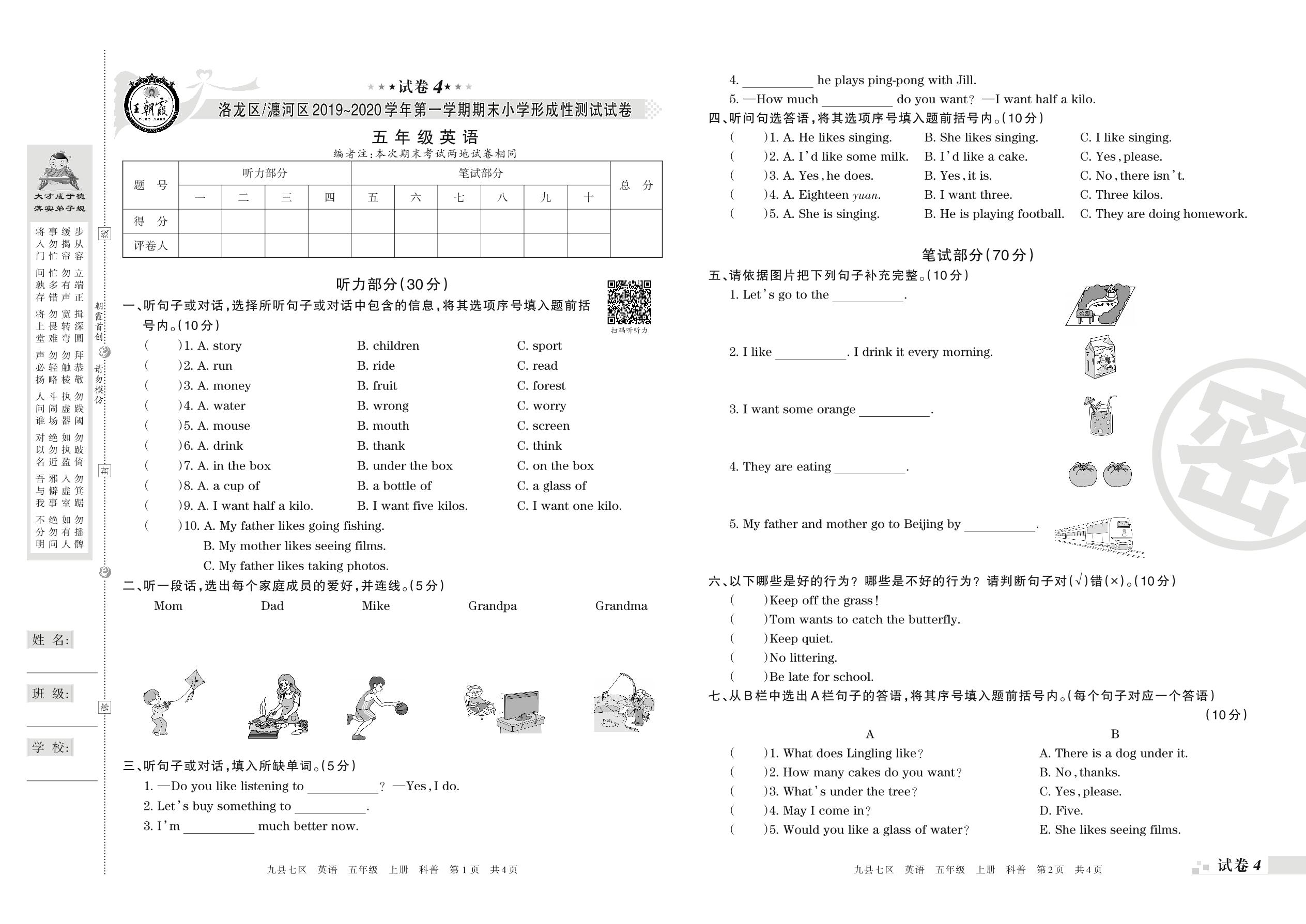 2019-2020学年第一学期洛阳市洛龙区、瀍河区五年级英语试卷(科普版)【4】