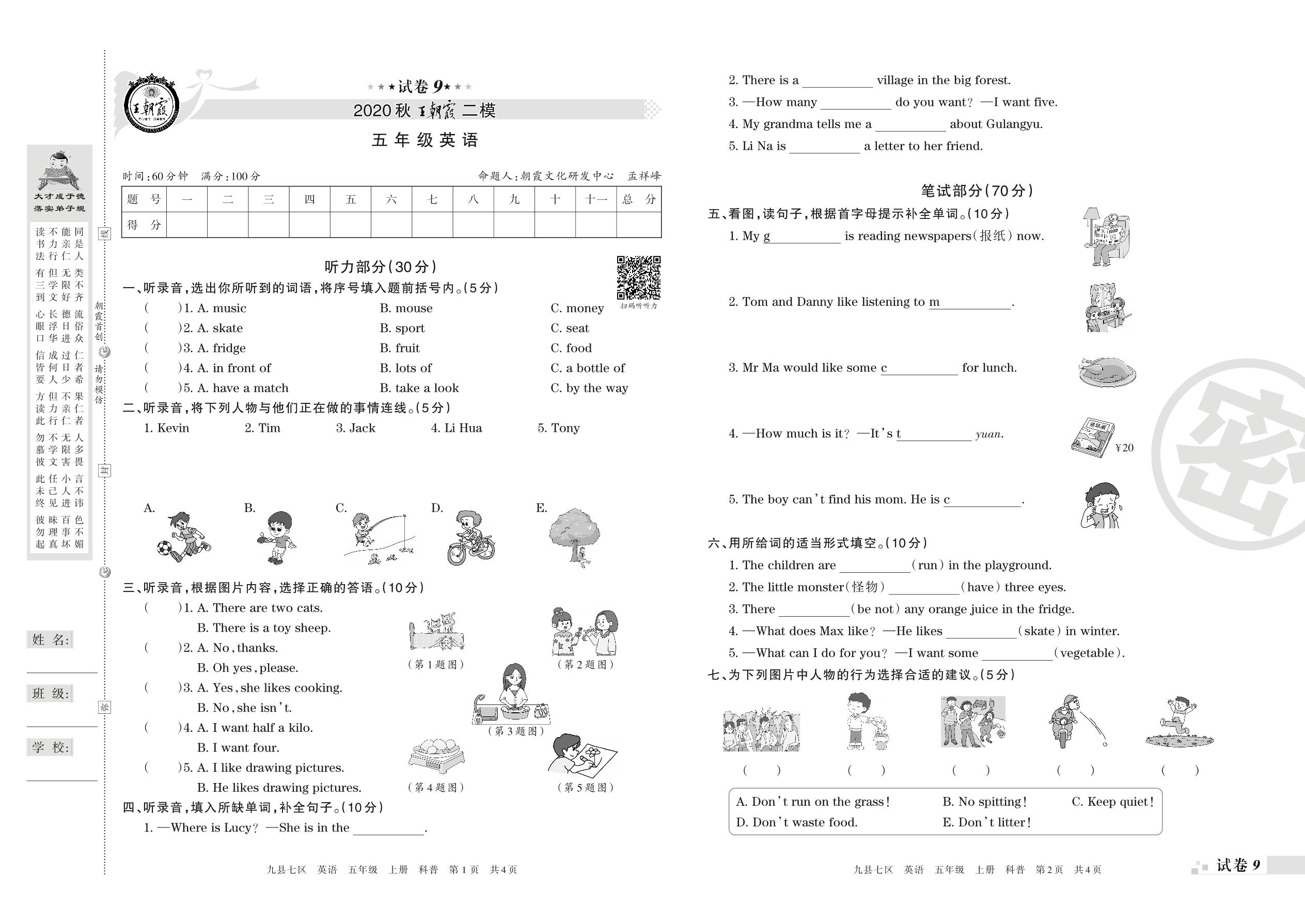 王朝霞期末模拟卷五年级上册英语(科普版)【9】
