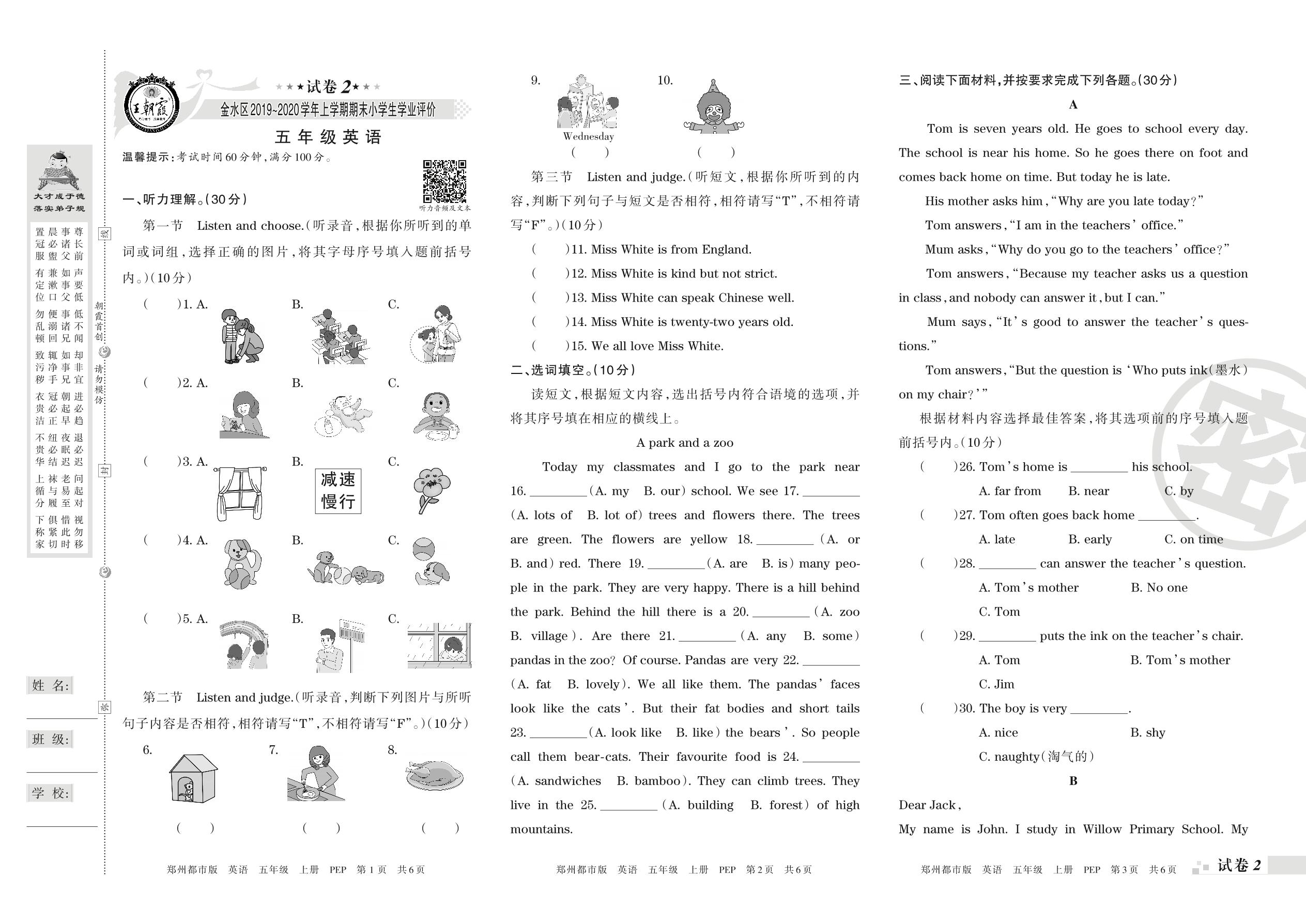 2019-2020学年第一学期郑州市金水区五年级英语试卷(PEP版)【2】