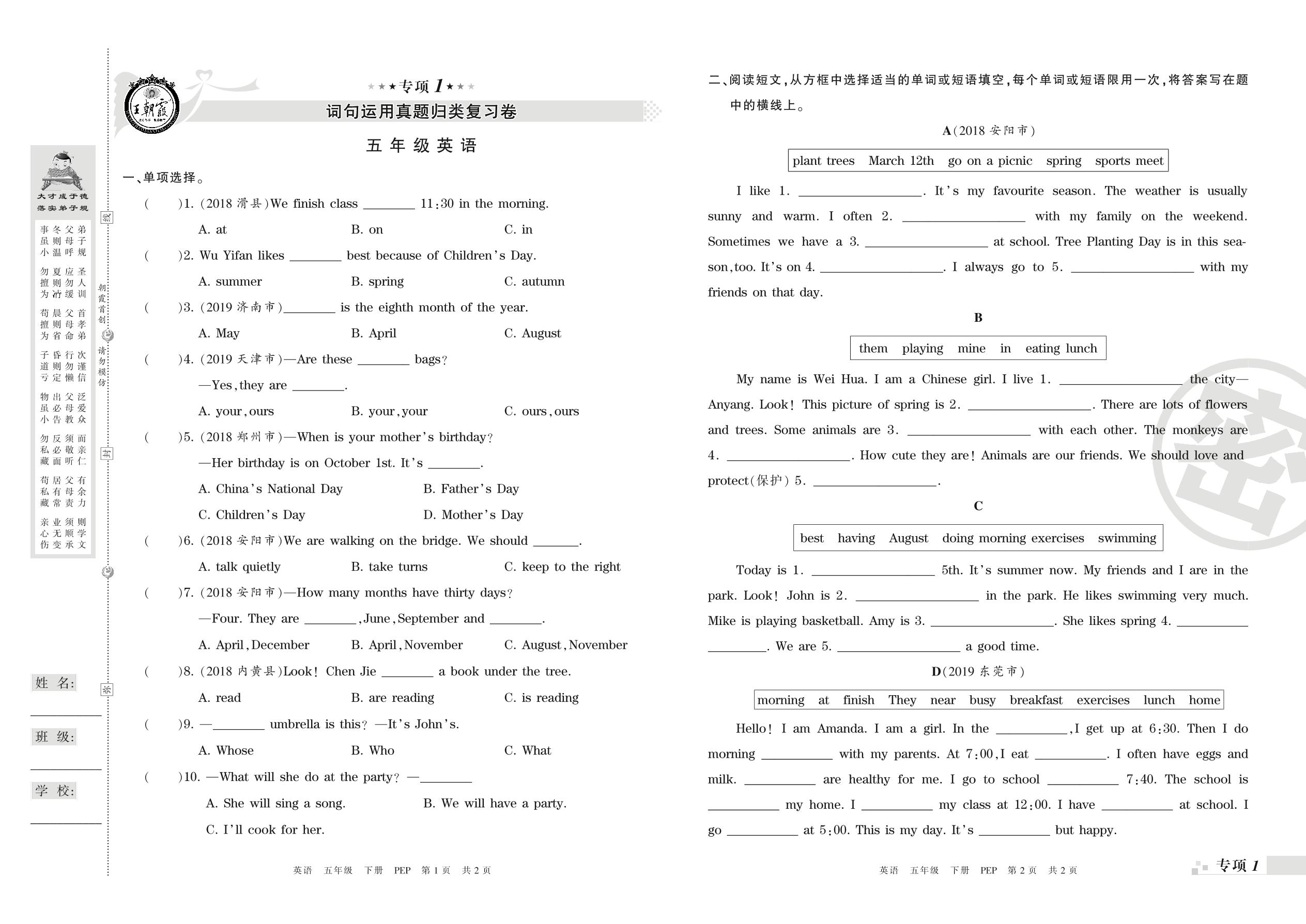 五年级英语人教PEP版(三起始)下册专项卷