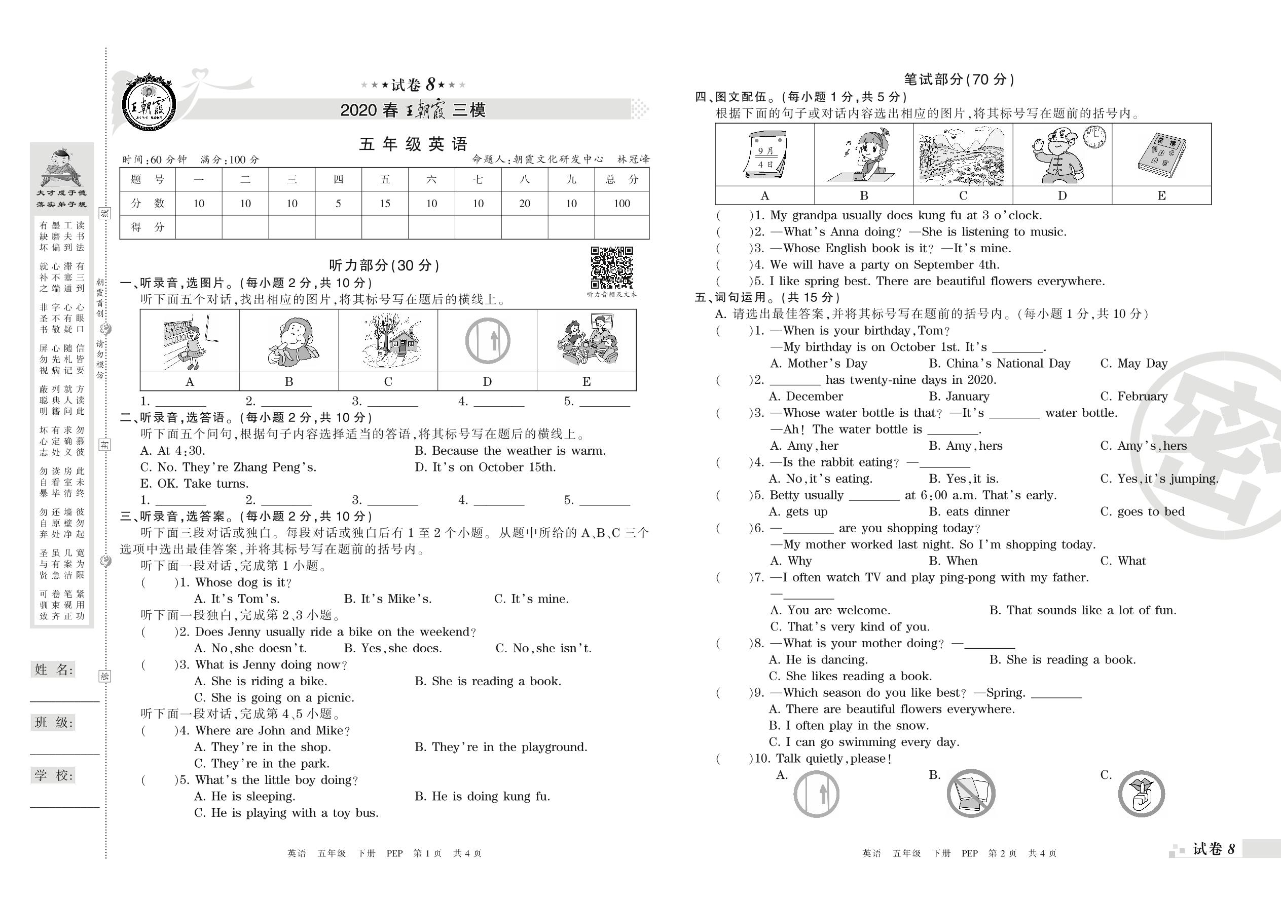 王朝霞期末模拟卷五年级下册英语(PEP版)_R210807141407【8】