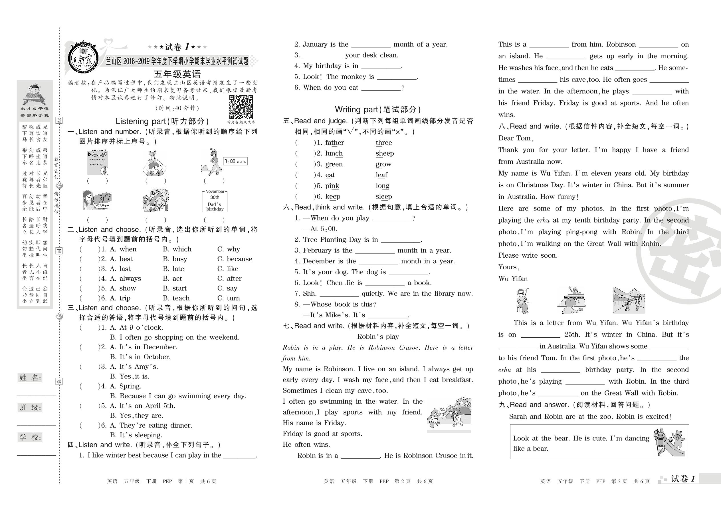 2018-2019学年第二学期临沂市兰山区五年级英语试卷(PEP版)【1】