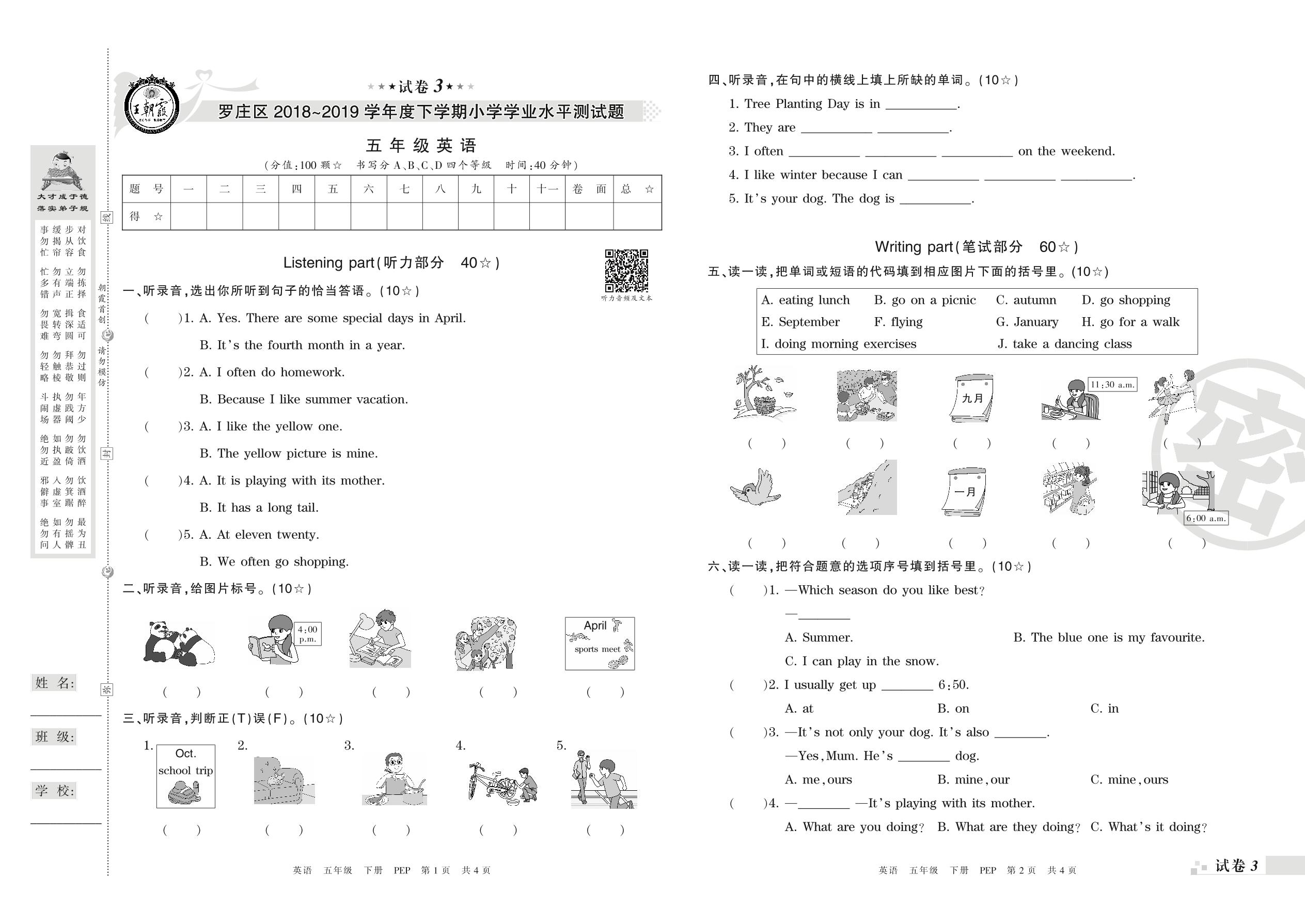 2018-2019学年第二学期临沂市罗庄区五年级英语试卷(PEP版)【3】