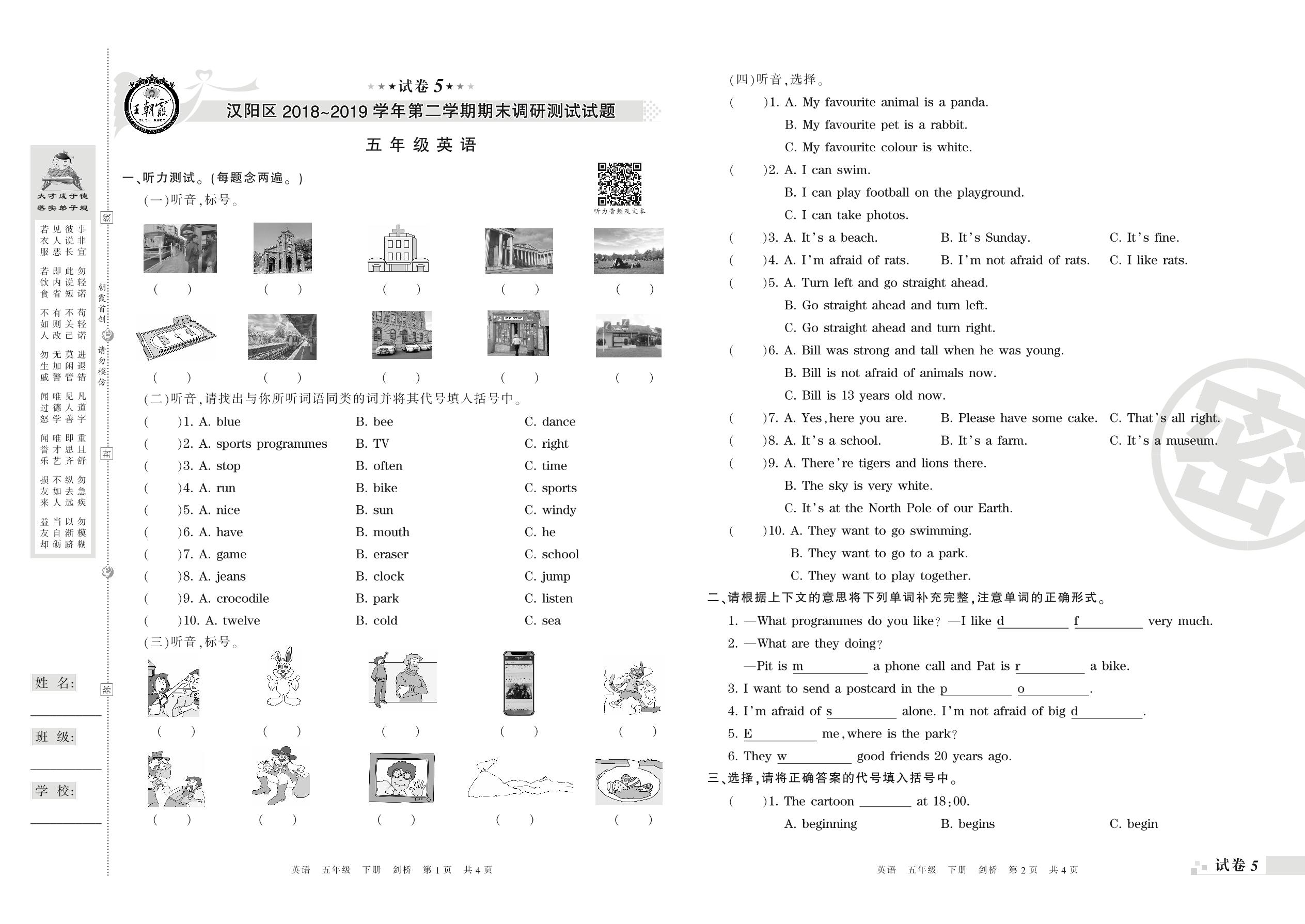 2018-2019学年第二学期武汉市汉阳区五年级英语试卷(剑桥版)【5】
