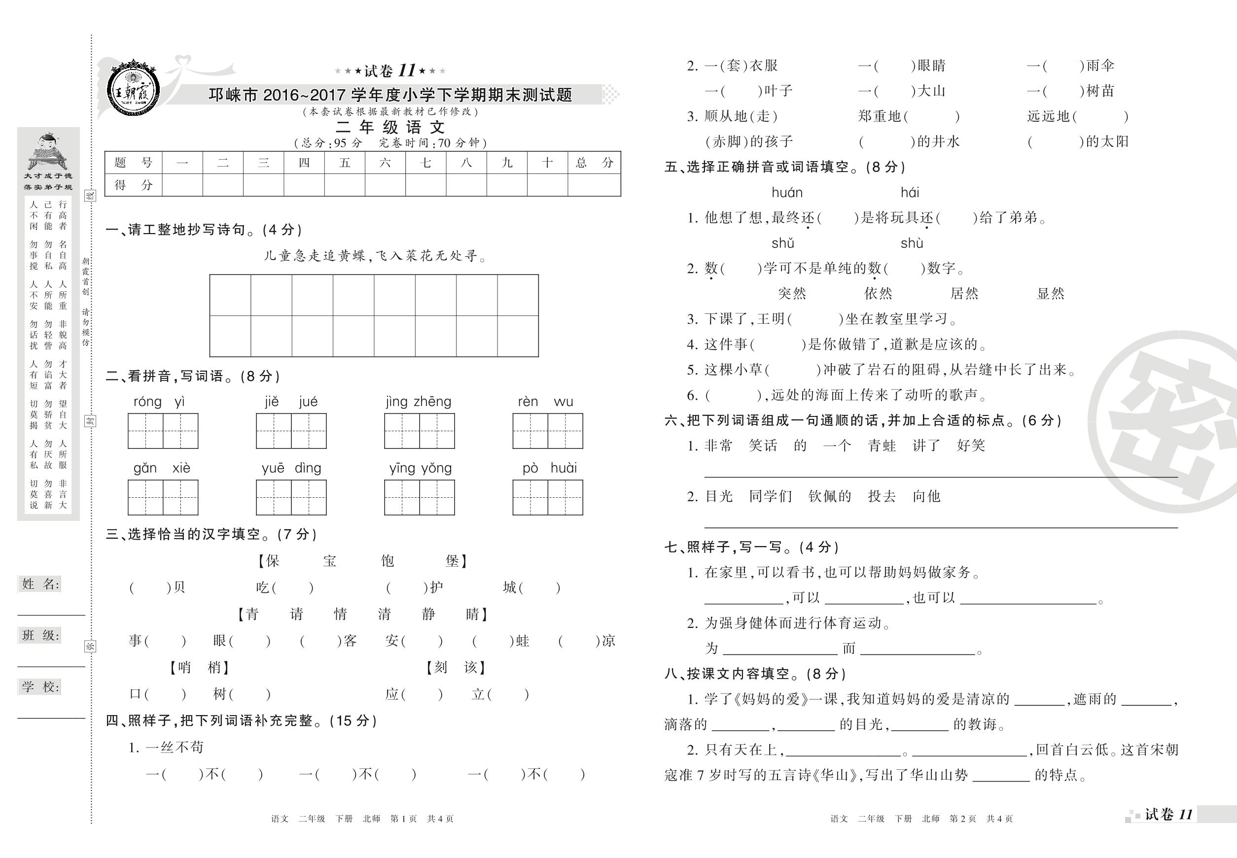 2016-2017学年第二学期邛崃市二年级语文试卷(北师版)【11】