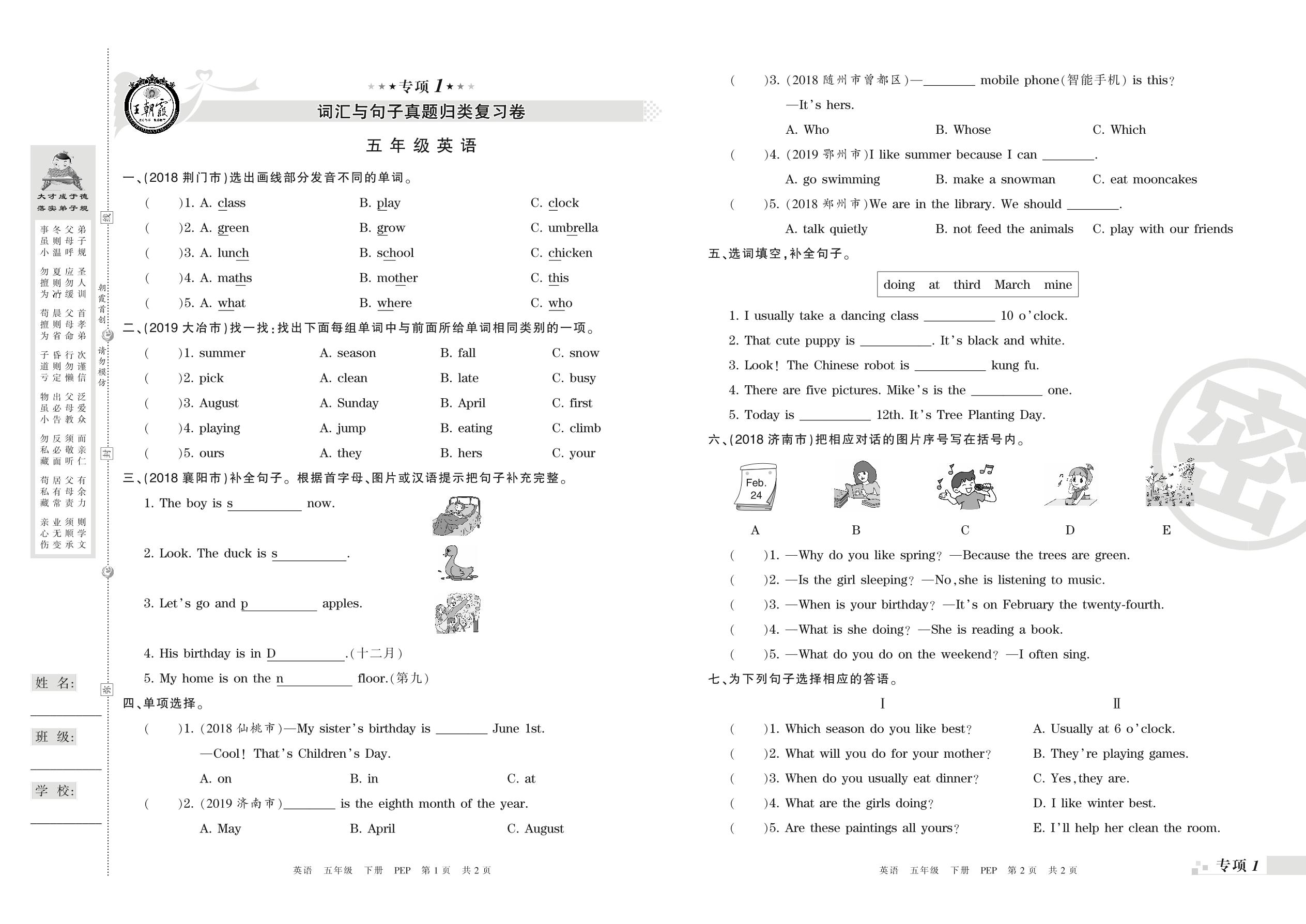五年级英语人教PEP版(三起始)下册专项卷