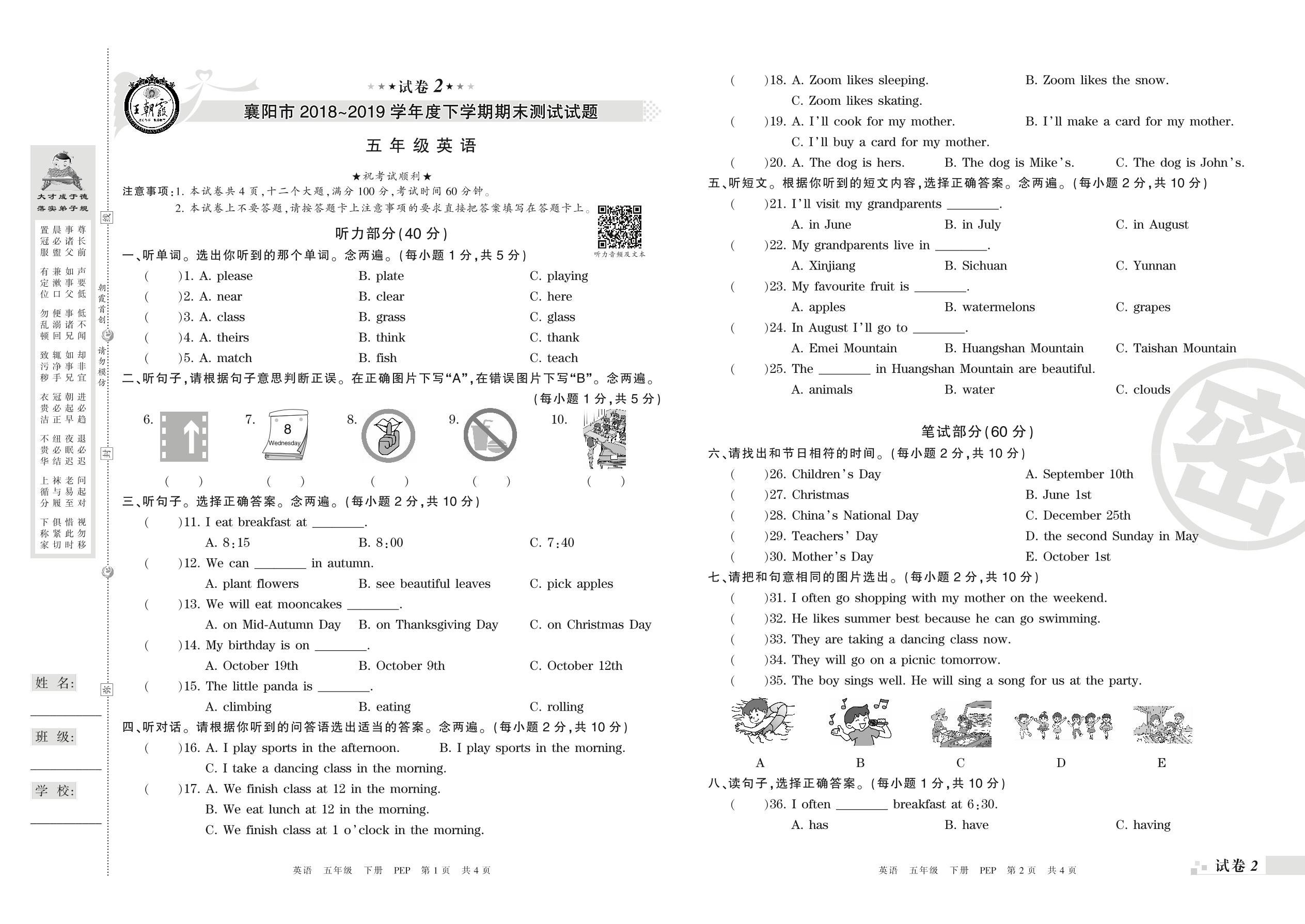 2018-2019学年第二学期襄阳市五年级英语试卷(PEP版)【2】