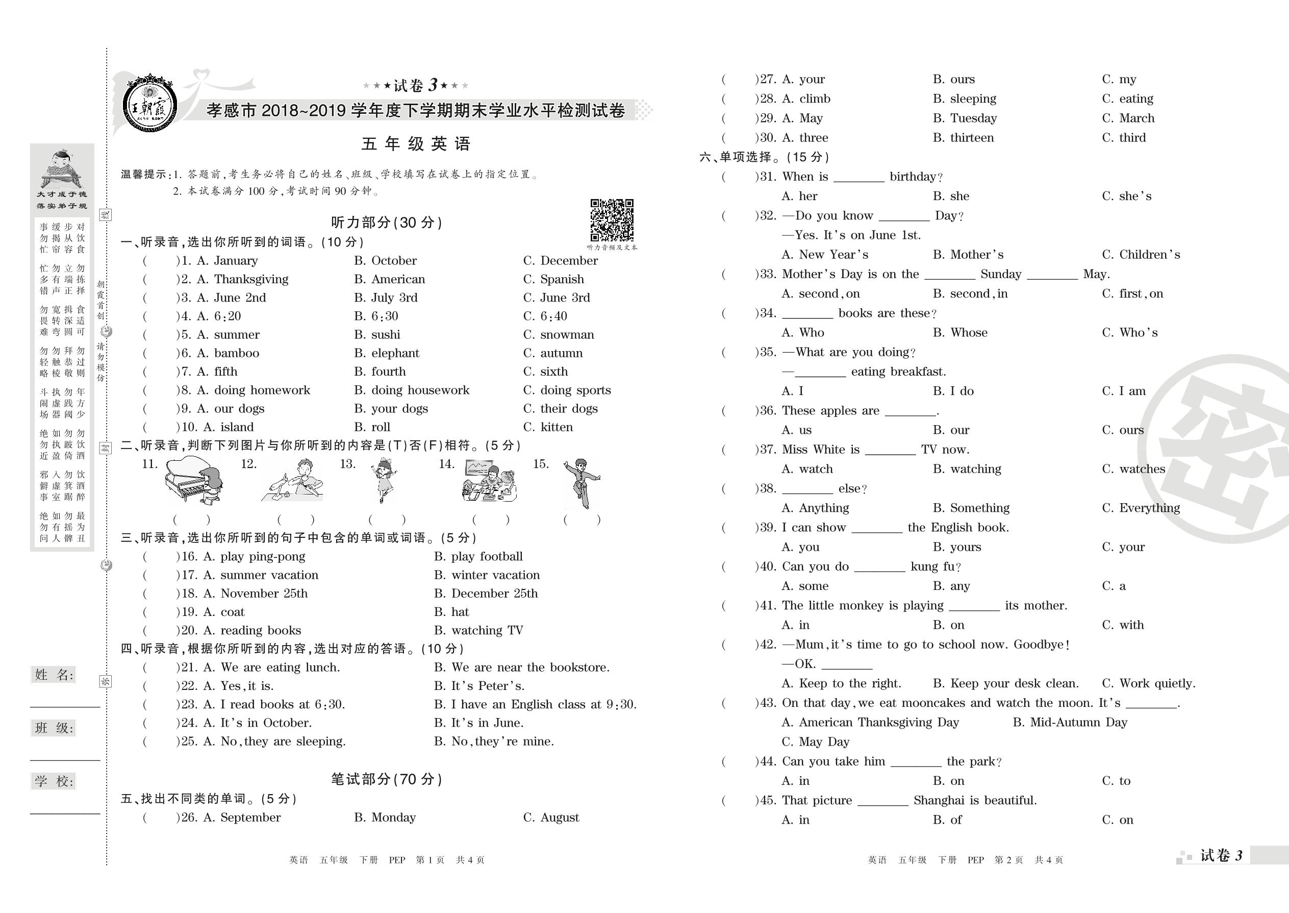 2018-2019学年第二学期孝感市五年级英语试卷(PEP版)【3】