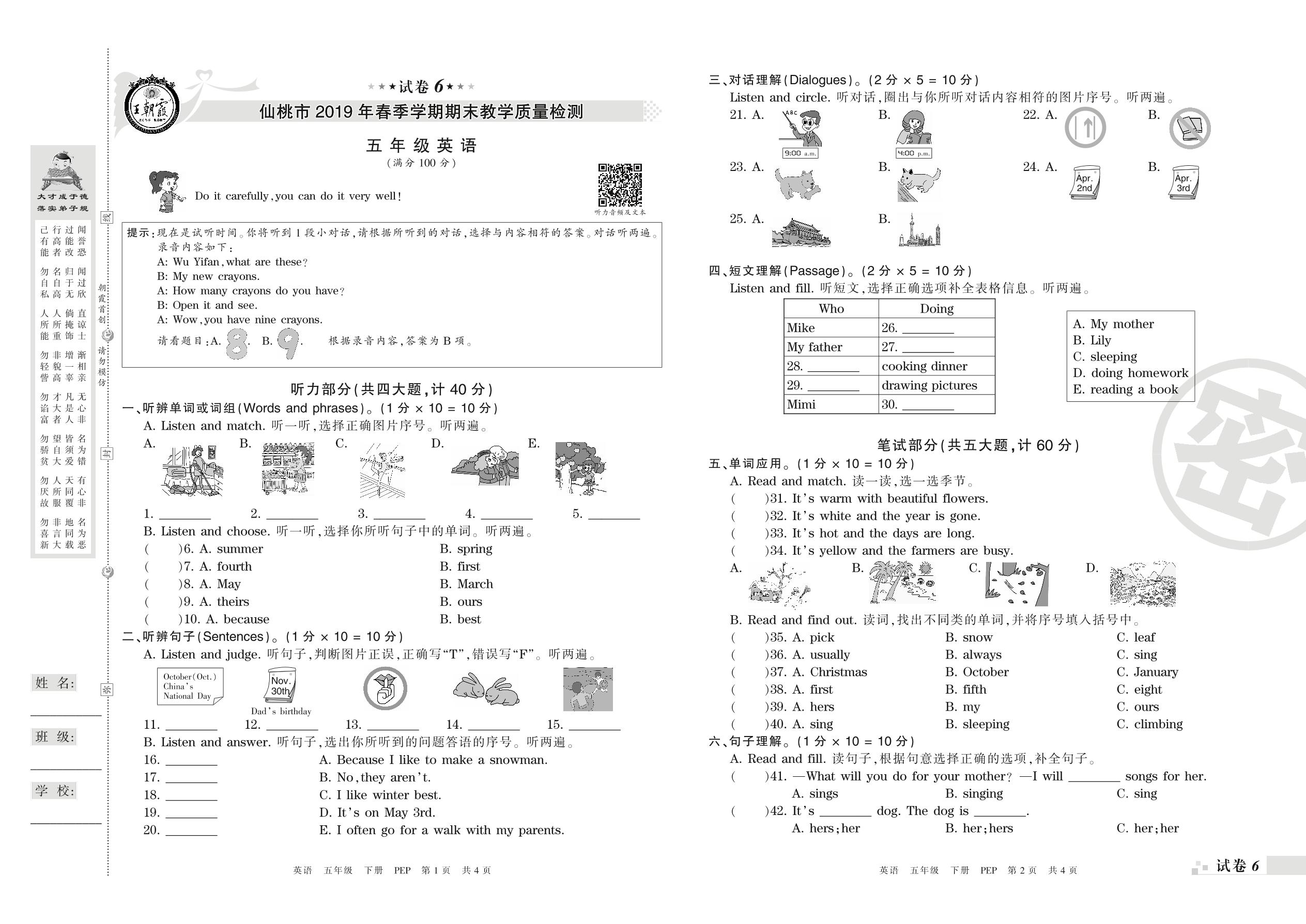 2018-2019学年第二学期仙桃市五年级英语试卷(PEP版)【6】