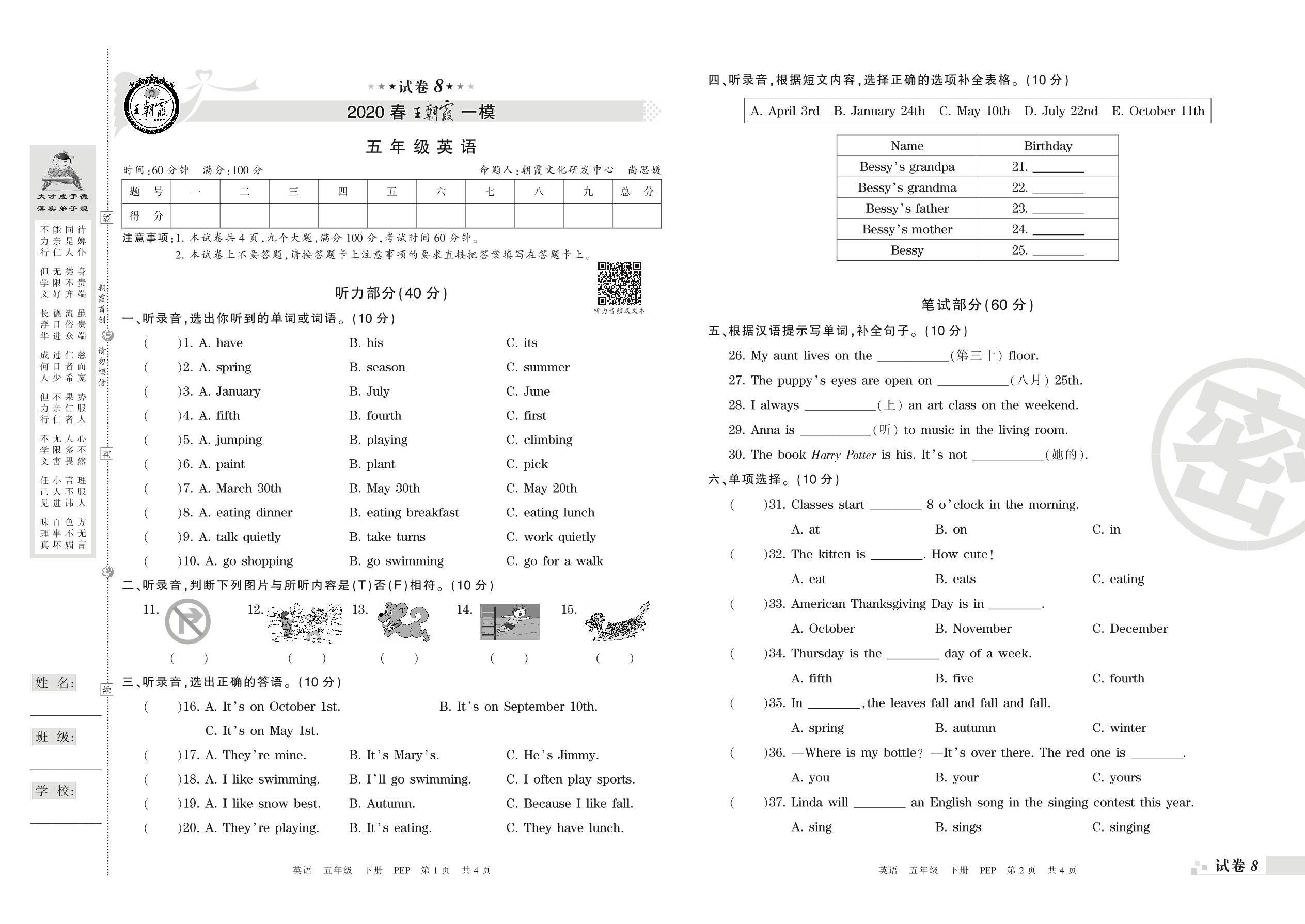 王朝霞期末模拟卷五年级下册英语(PEP版)_R210807141747【8】