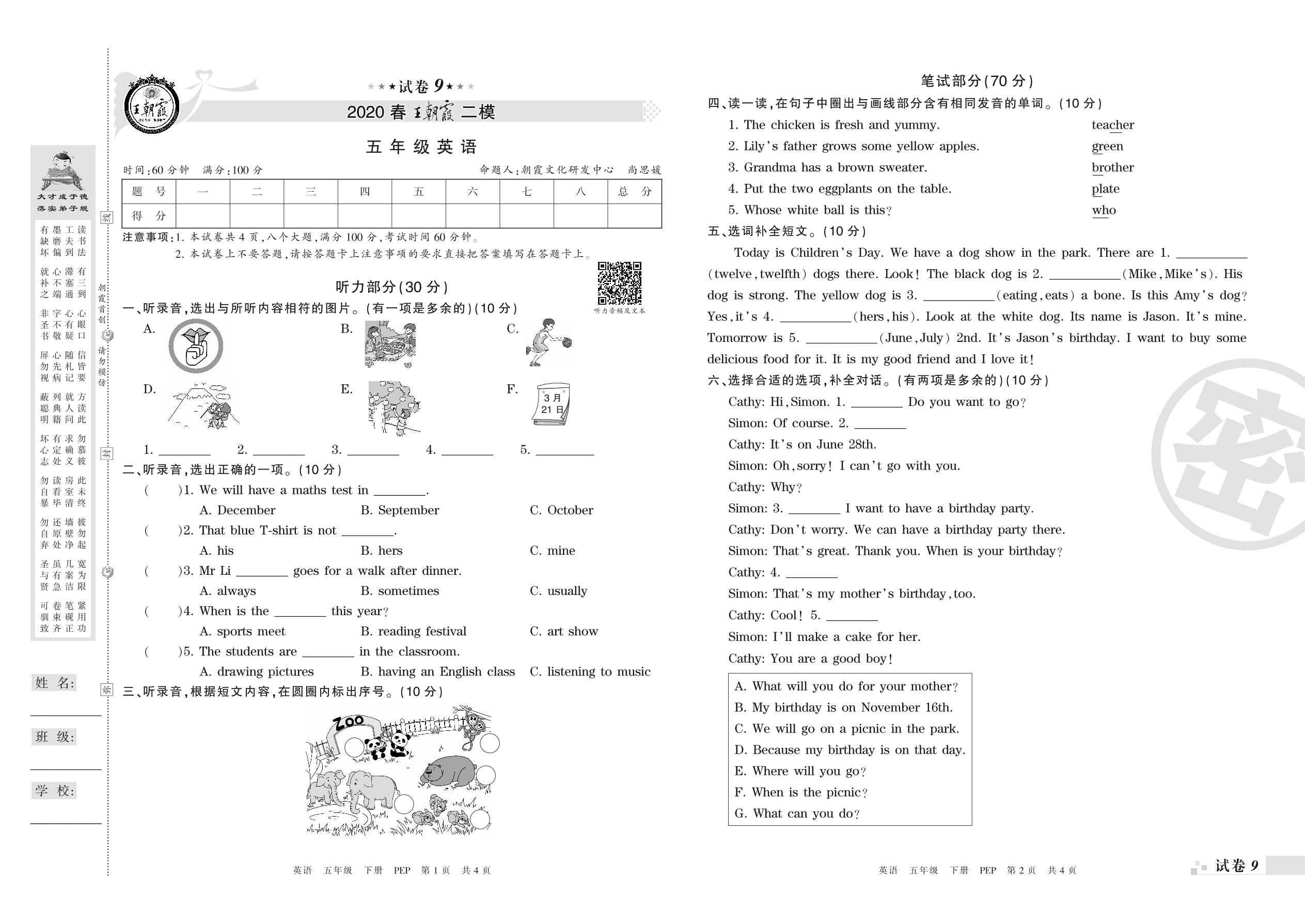 王朝霞期末模拟卷五年级下册英语(PEP版)_R210807141751【9】