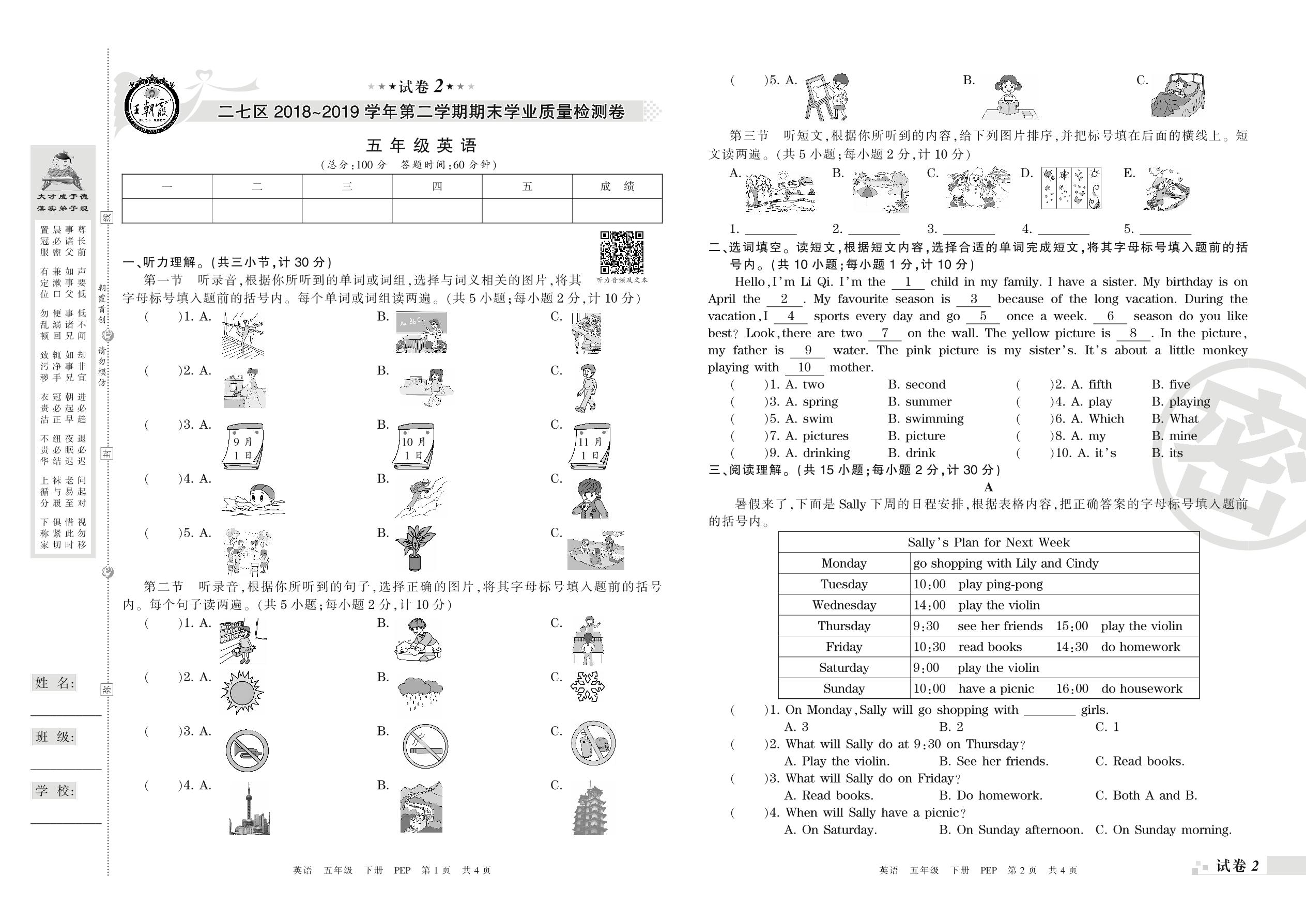 2018-2019学年第二学期郑州市二七区五年级英语试卷(PEP版)【2】