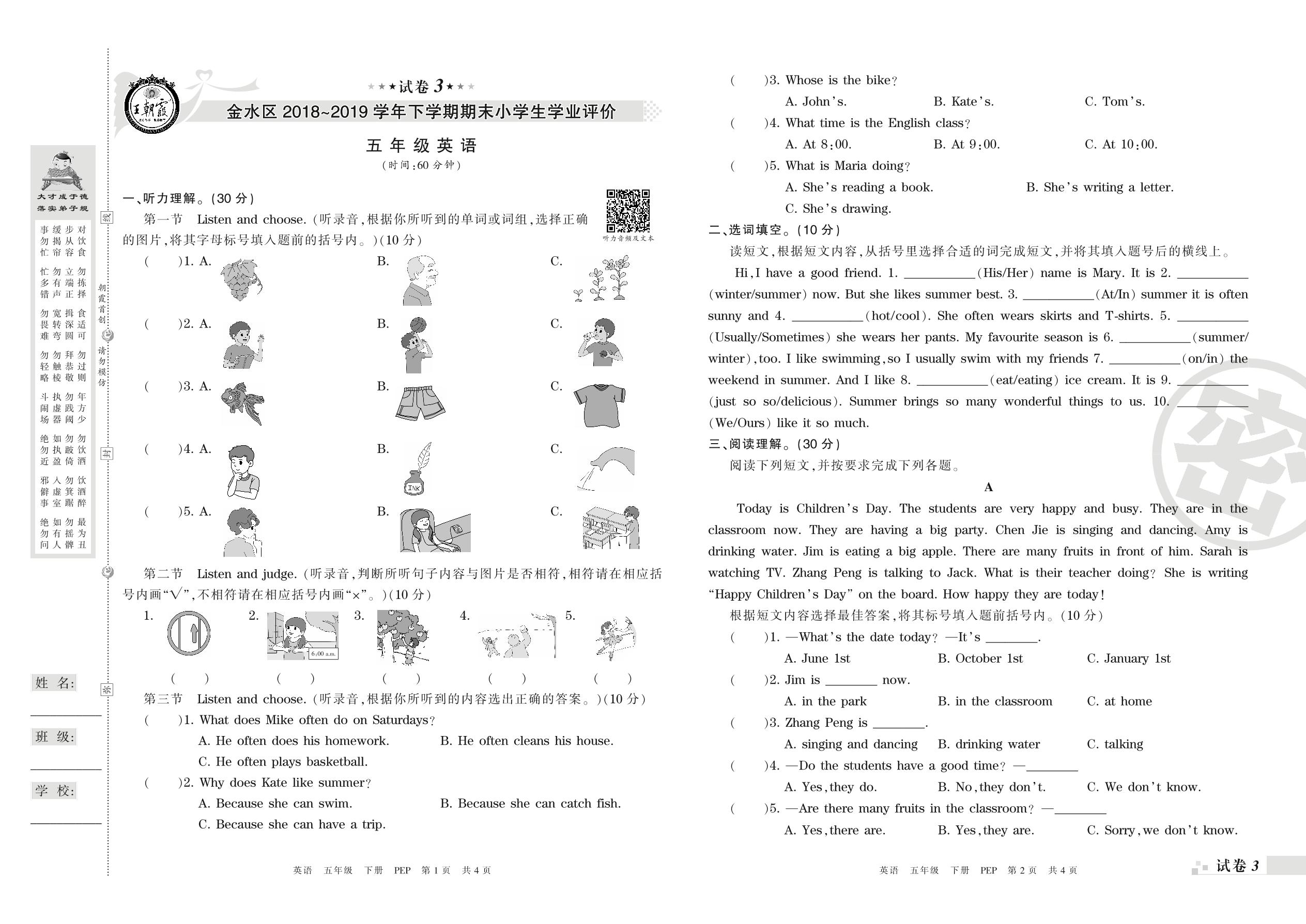 2018-2019学年第二学期郑州市金水区五年级英语试卷(PEP版)【3】