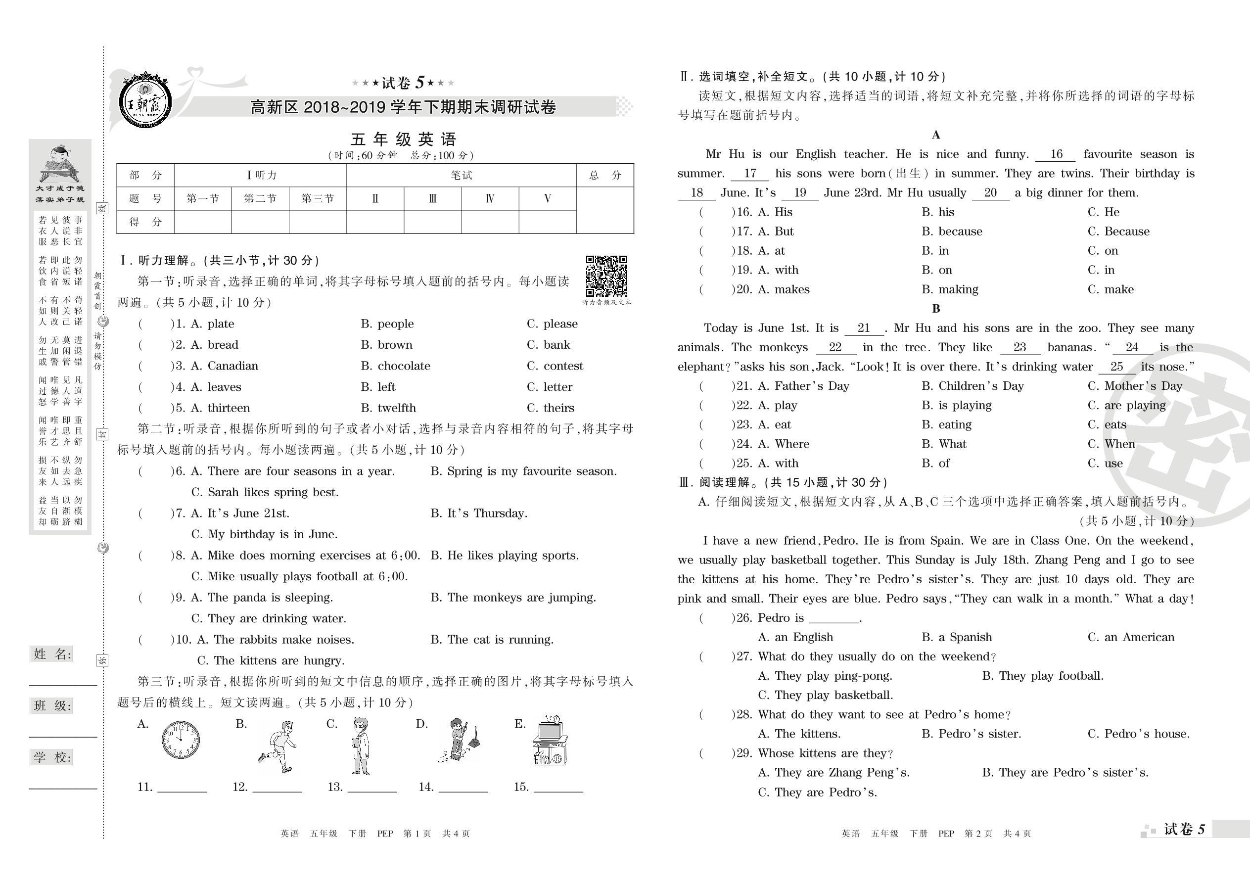 2018-2019学年第二学期郑州市高新区五年级英语试卷(PEP版)【5】