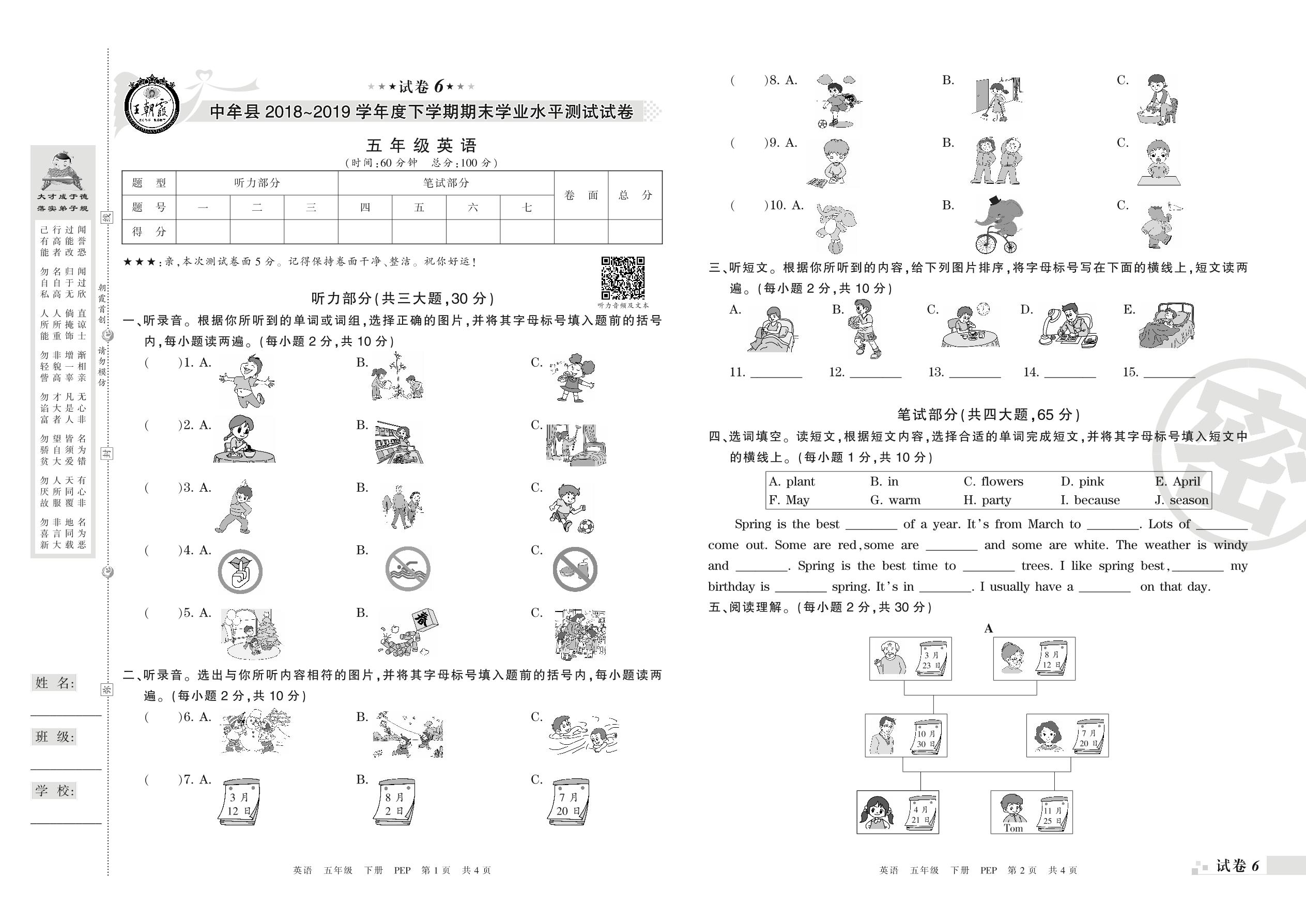 2018-2019学年第二学期郑州市中牟县五年级英语试卷(PEP版)【6】