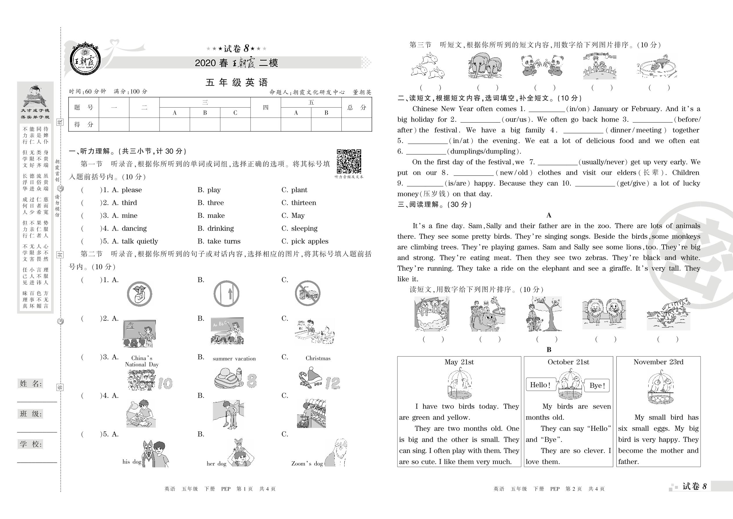 王朝霞期末模拟卷五年级下册英语(PEP版)_R210807141849【8】