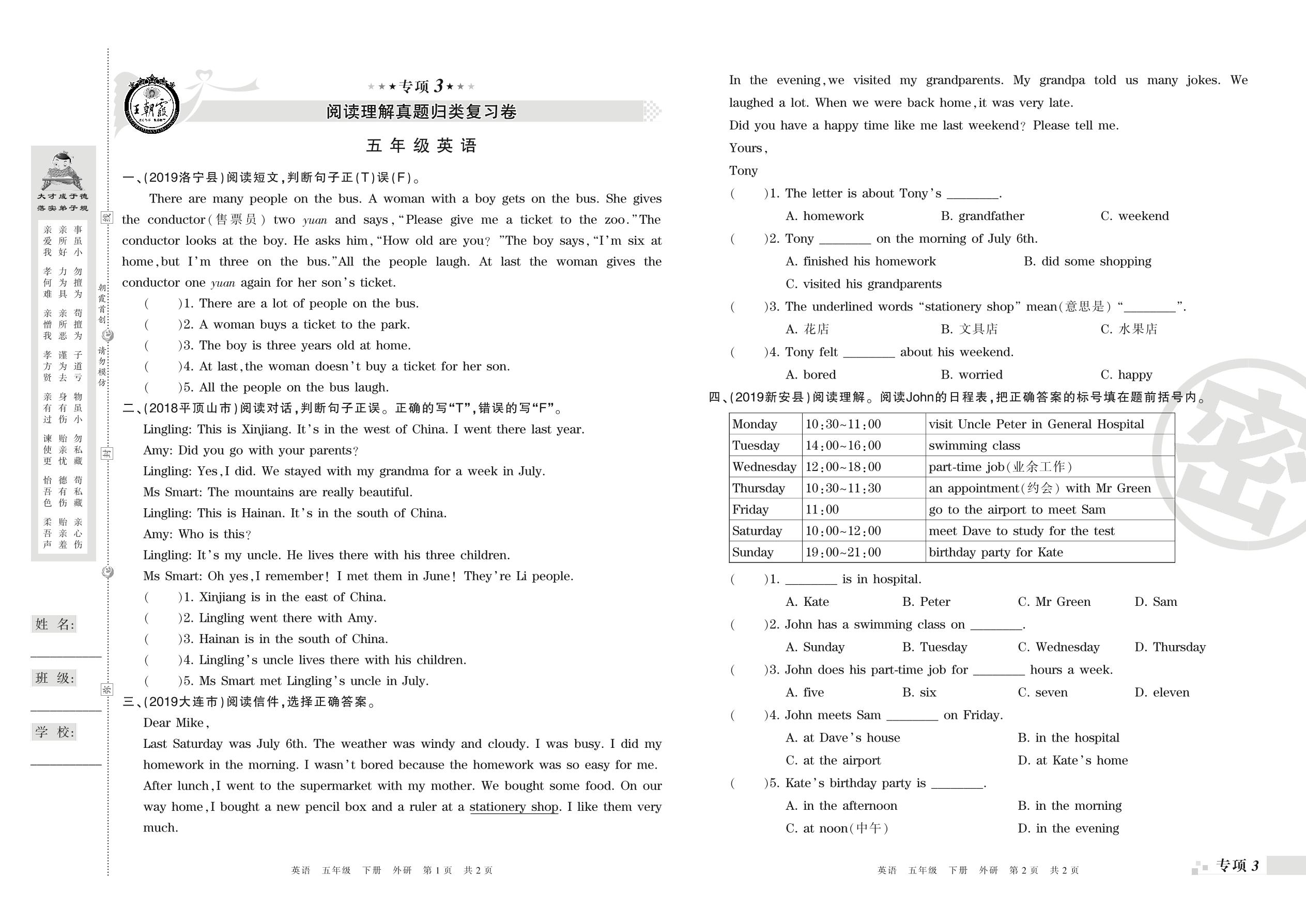 王朝霞期末专项卷——阅读理解真题归类复习卷、新颖题速递:绘本阅读五年级下册英语(外研版)_R210807141906【0】