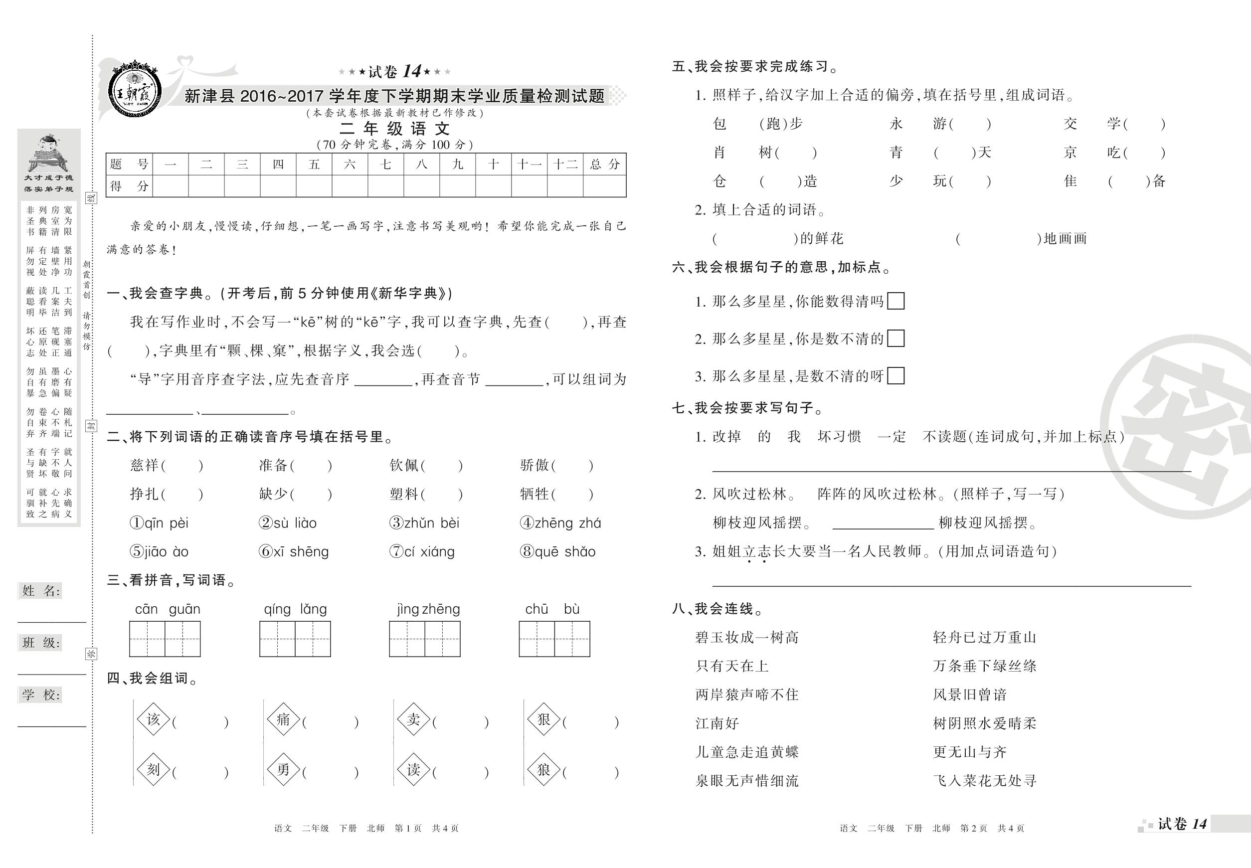 2016-2017学年第二学期成都市新津县二年级语文试卷(北师版)【14】