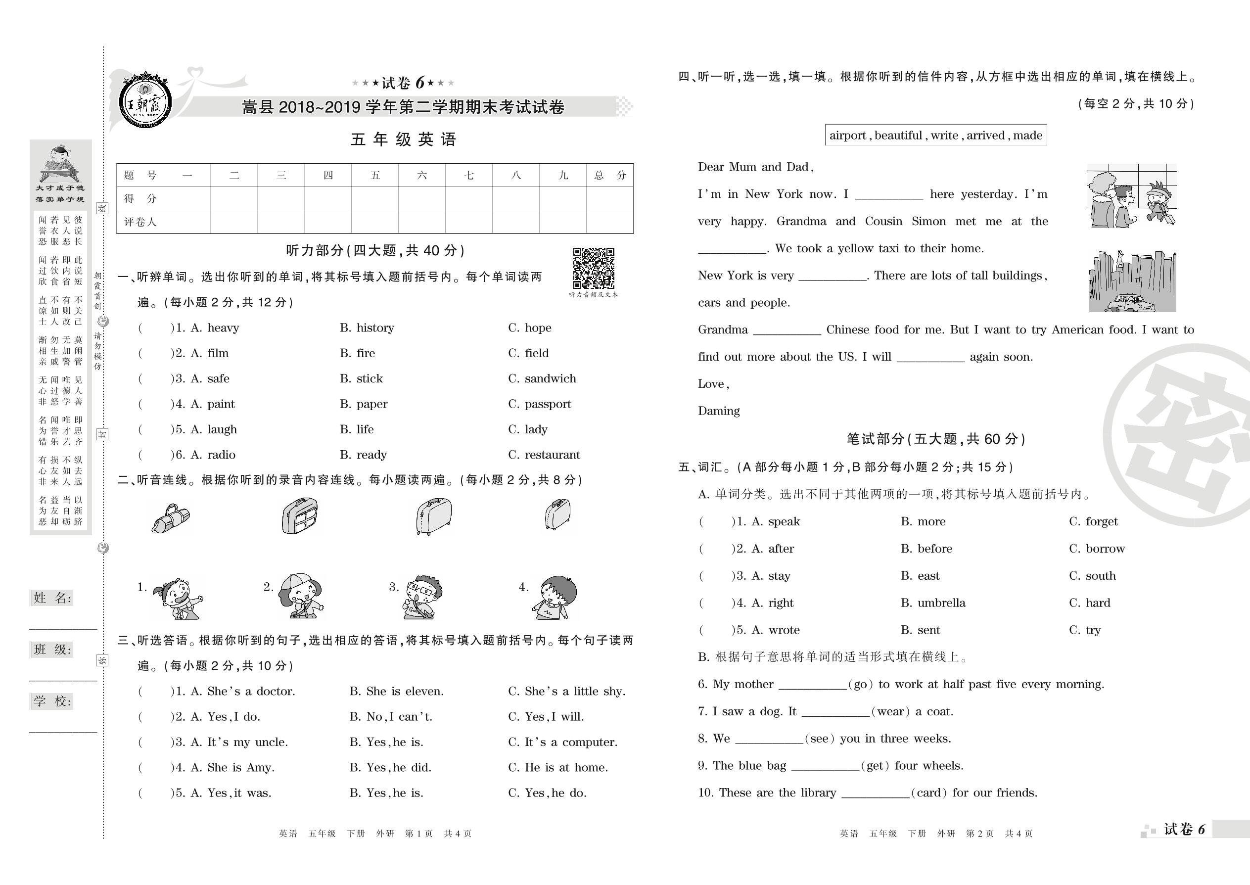2018-2019学年第二学期洛阳市嵩县五年级英语试卷(外研版)【6】