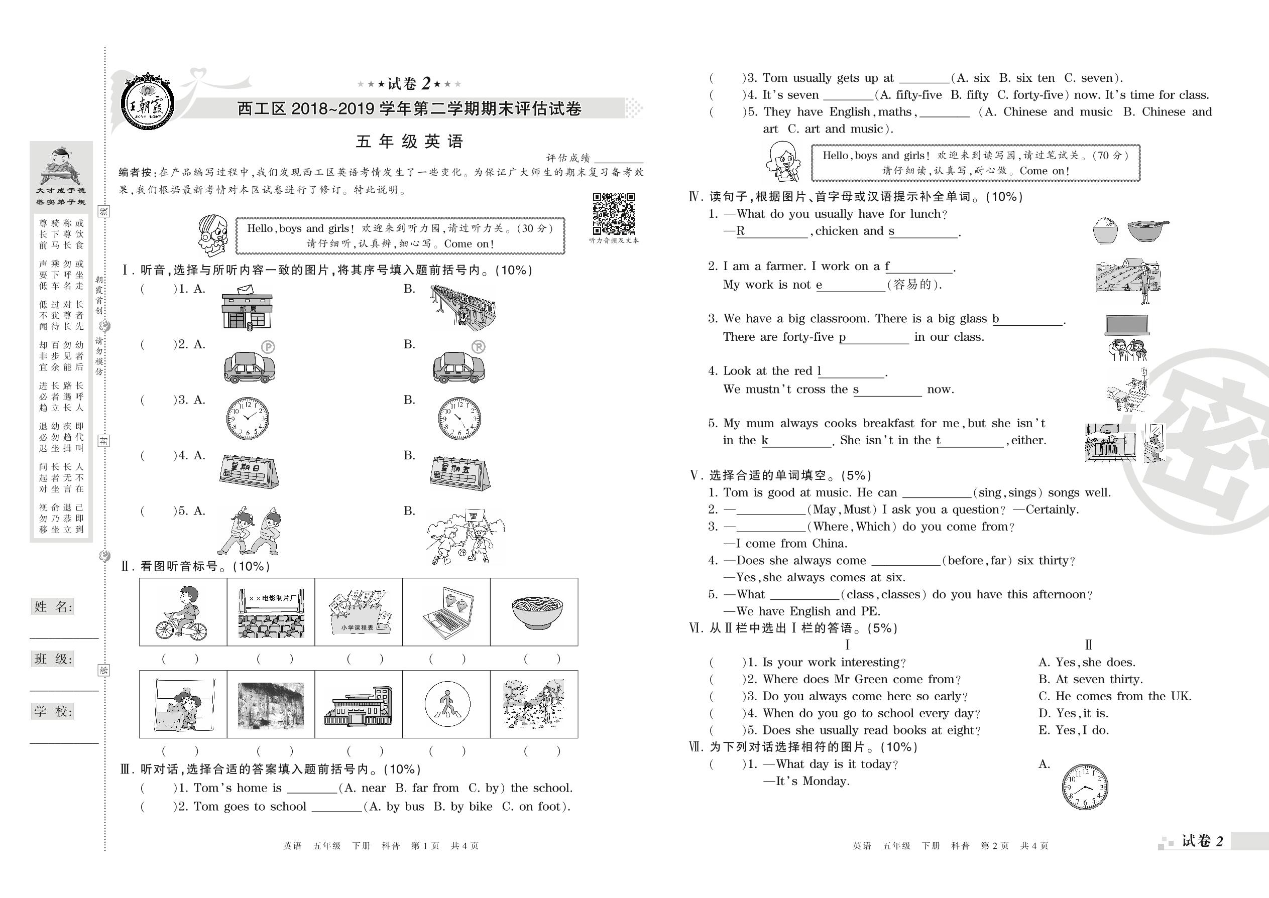 2018-2019学年第二学期洛阳市西工区五年级英语试卷(科普版)【2】