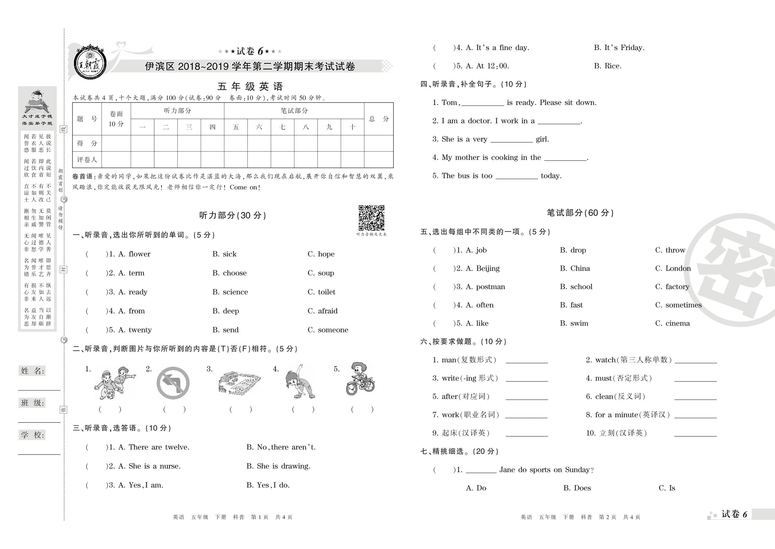 2018-2019学年第二学期洛阳市伊滨区五年级英语试卷(科普版)【6】