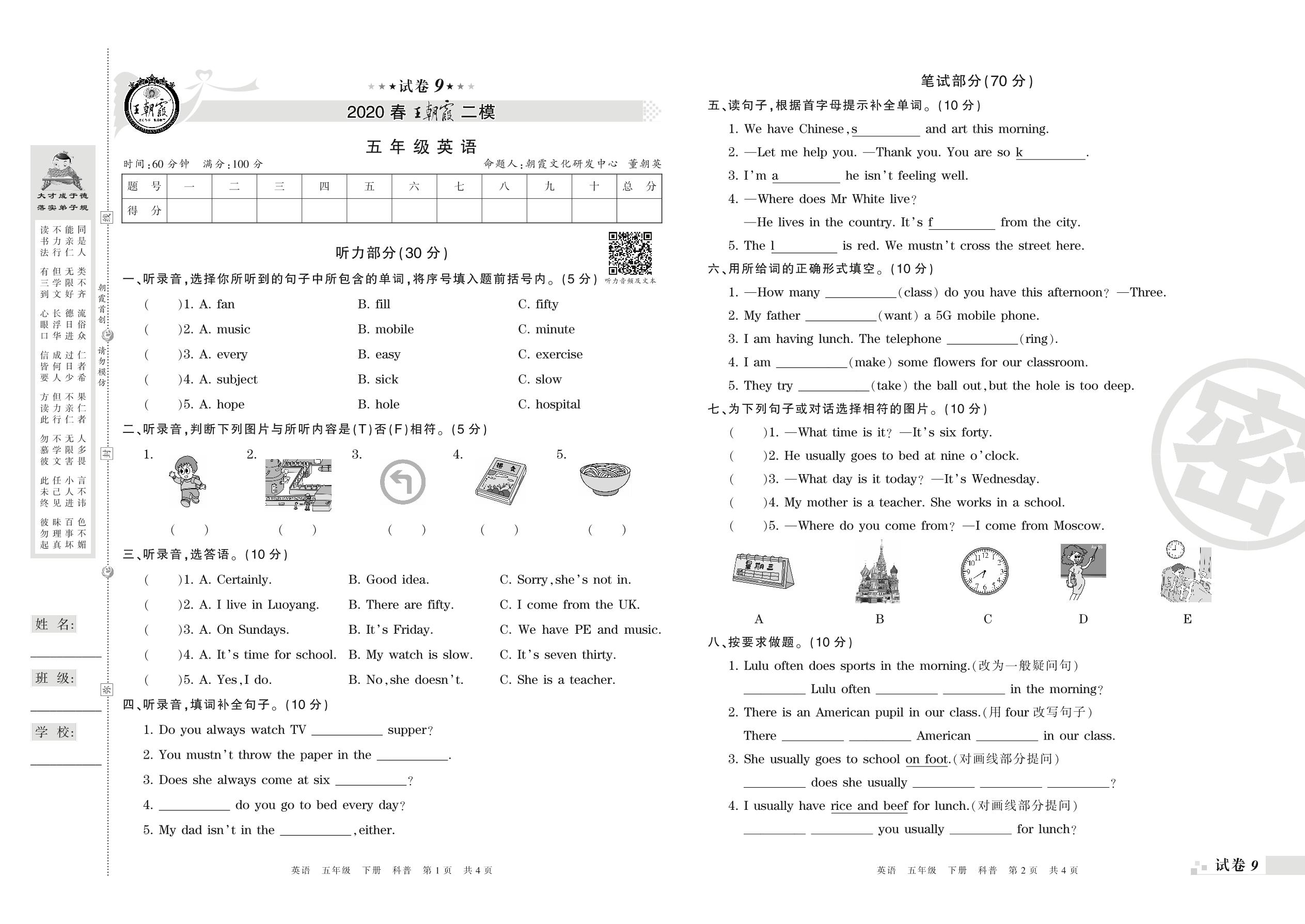 王朝霞期末模拟卷五年级下册英语(科普版)_R210807142034【9】
