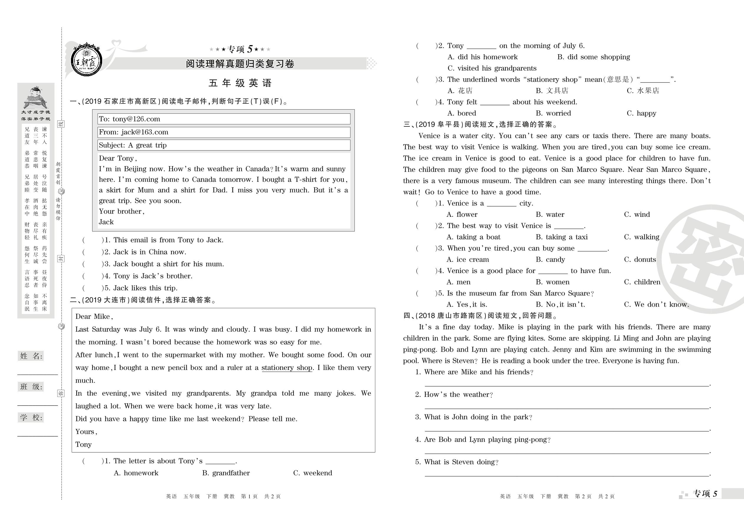 王朝霞期末专项卷——阅读理解、补全短文与写作真题归类复习卷五年级下册英语(冀教版)_R210807142106【0】