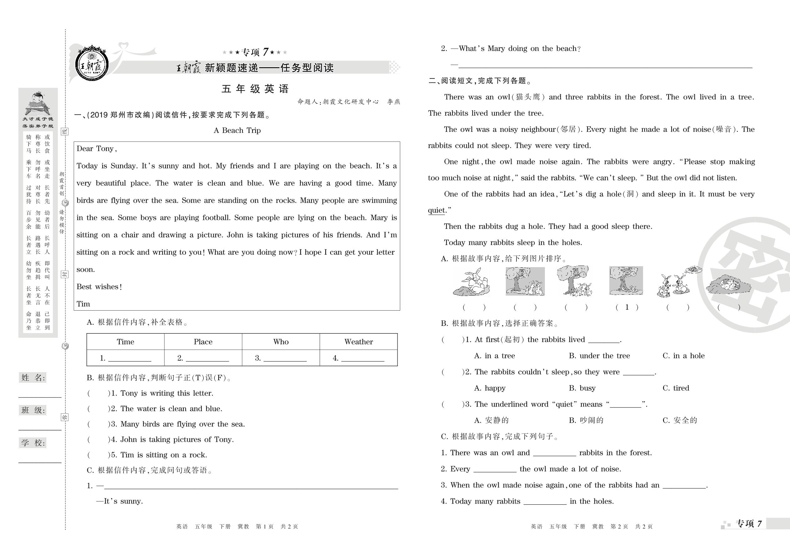 王朝霞期末专项卷——新颖题速递:任务型阅读、绘本阅读五年级下册英语(冀教版)_R210807142109【0】
