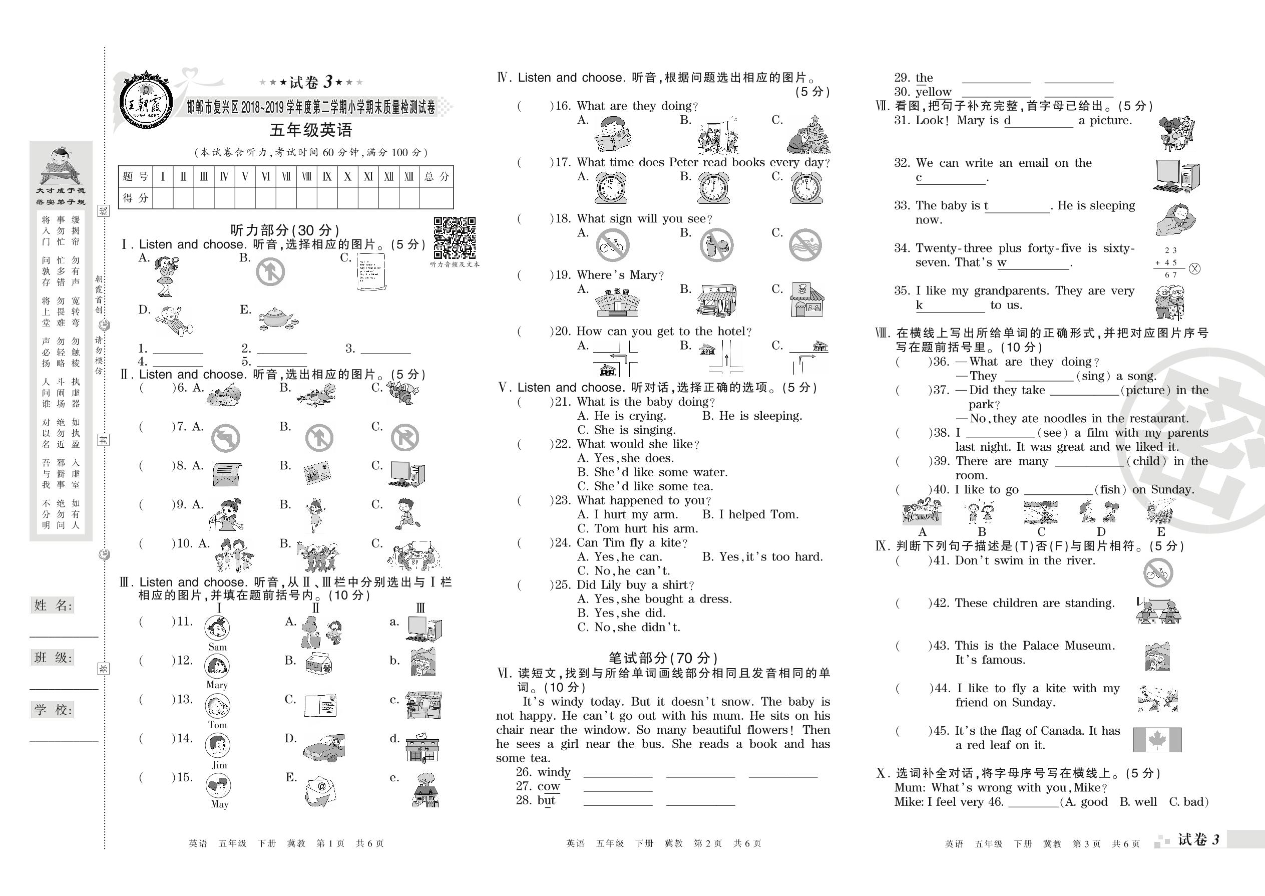 2018-2019学年第二学期邯郸市复兴区五年级英语试卷(冀教版)【3】