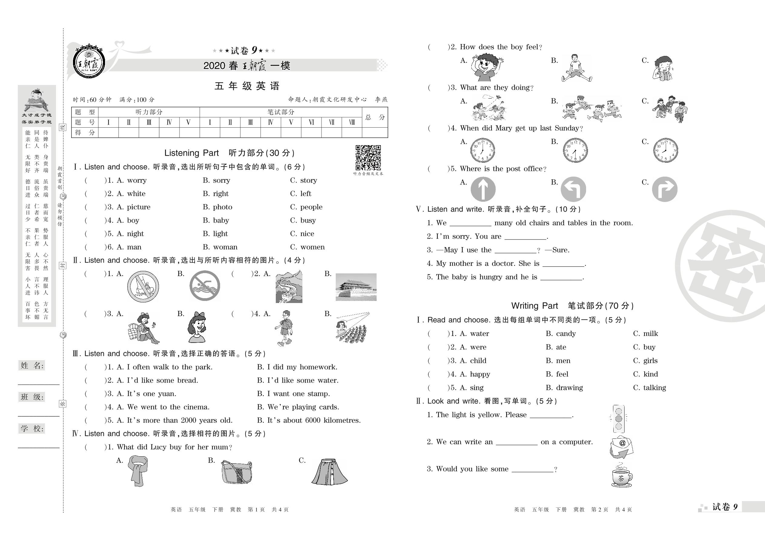 王朝霞期末模拟卷五年级下册英语(冀教版)_R210807142148【9】