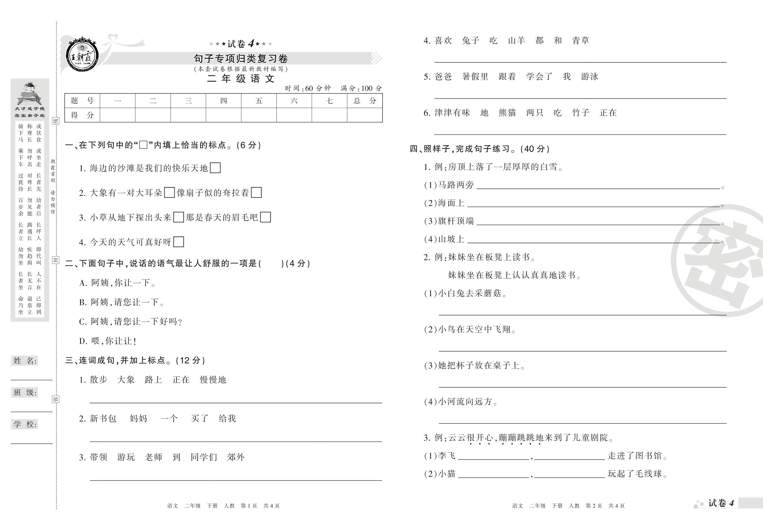 王朝霞期末专项卷——句子专项归类复习卷二年级下册语文(人教版)_R21080182028【4】