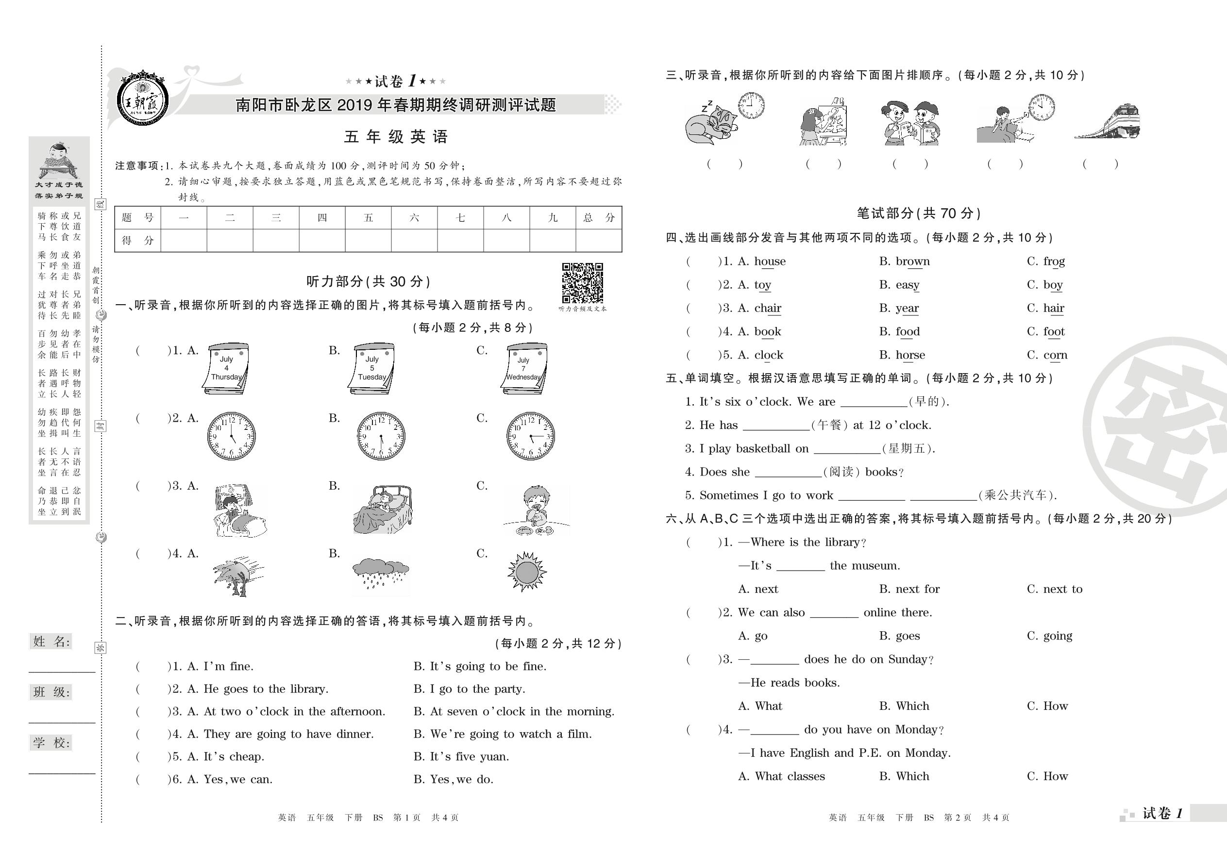 2018-2019学年第二学期南阳市卧龙区五年级英语试卷(北师版)【1】